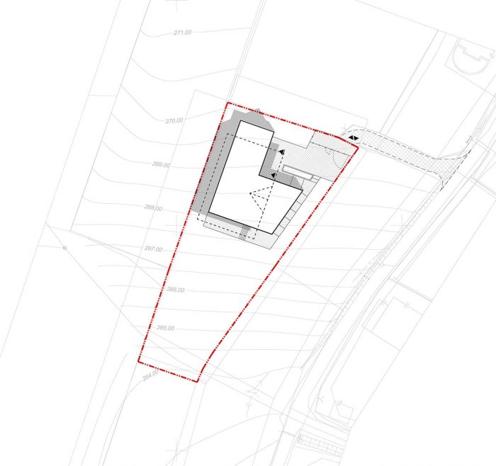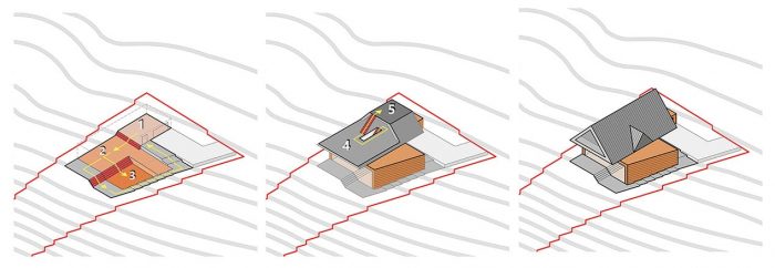 A ground floor from the entrance and the garage entrance side is connected with the existing ground level. Then in the living area – kitchen and dining room – the level are slightly sloping, opening the high interiors onto the magnificent view.