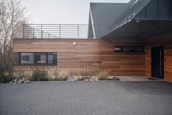 The ground floor, which is modernist and entirely glazed from the south side, was finished with naturally patinating and aging wood, as seen in historical eaves houses. The contrasting, expressive form of the attic was finished with the use of modern material, Ruukki Classic roofing sheet, which defines the precise architectural detail.