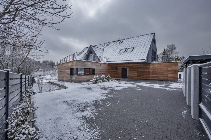 The minimalistic solid of the attic, enclosed in a puristic triangle and tucked with the roofing sheet creates a distinct arcade, protecting the house against sun and rain. From the south side, the attic houses the interior of a scenic bedroom, opening up to the ridge, and from the north side – a two-level study with a mezzanine on the highest, already fifth level. The Lesser Polish Eaves Cottage is a designer house, but at the same time it is durable and timeless, as it is firmly rooted in tradition…and in BXB studio we strongly believe that this is the factor that makes it something more than just another modern building.