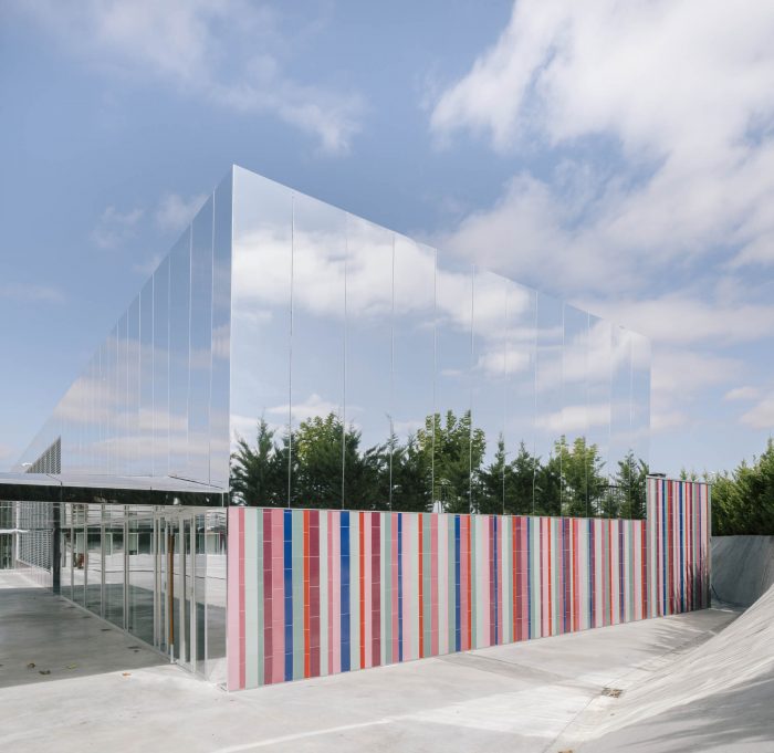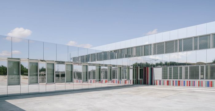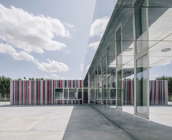 The upper areas are coated with a StacbondR composite aluminum finished mirror panel. These surfaces fade reflecting the sky and also the perimeter trees making this second level, necessary in the program, disappears like a magic game, and the school infrastructure recovers more domestic scales.