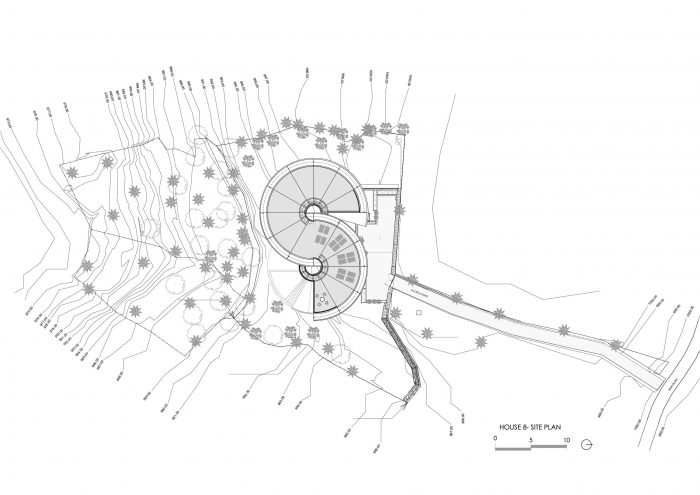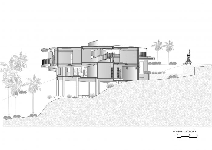 房屋优雅地矗立在陡峭的斜坡上,仿佛漂浮在地面之上,与丛林环境和谐地融为一体。精心设计的园林景观模糊了房屋与自然的界限,将房屋结构转化为一个有生命的实体,象征着与周围环境的和谐统一。