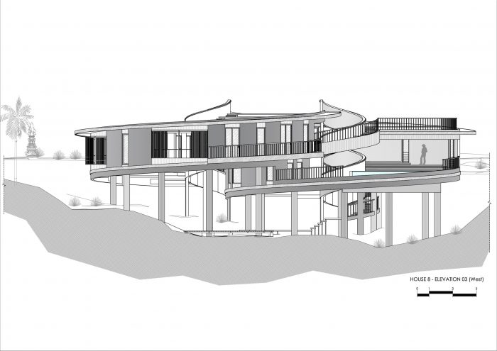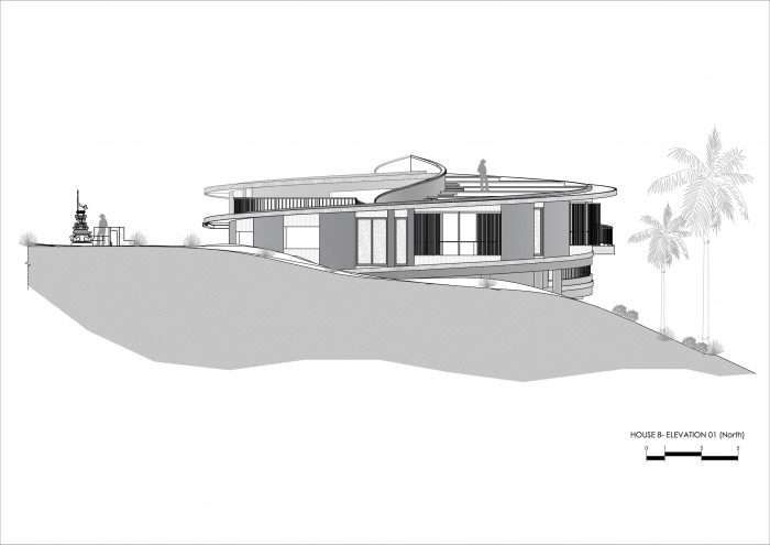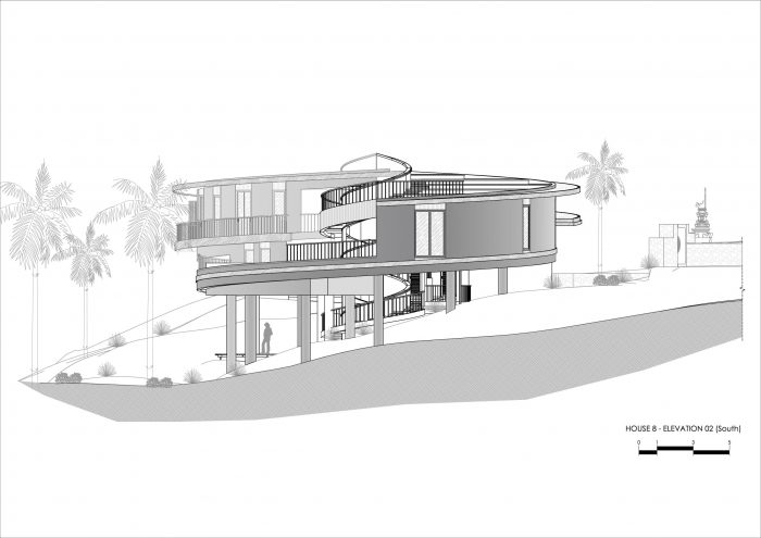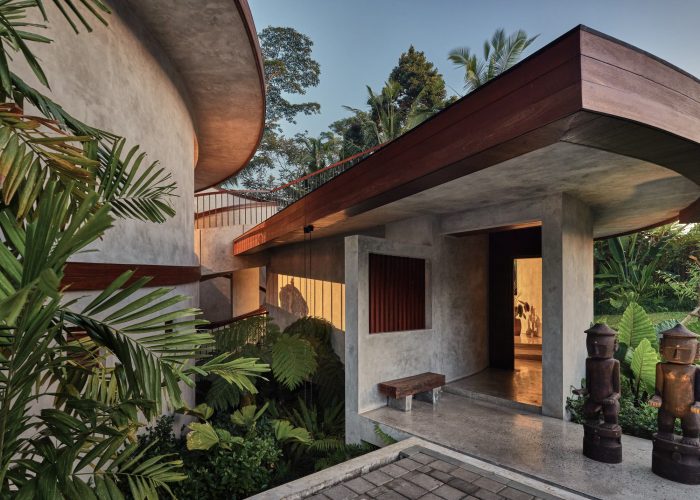 The house stands gracefully on a steep slope, seemingly floating above the ground, harmoniously integrating with the jungle environment. Thoughtful landscaping blurs the boundaries between the house and nature, transforming the structure into a living entity that symbolizes unity with the surrounding environment.