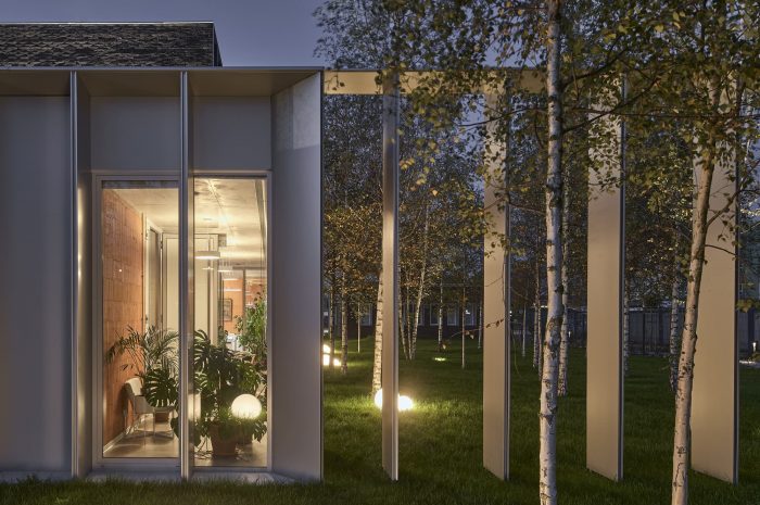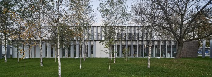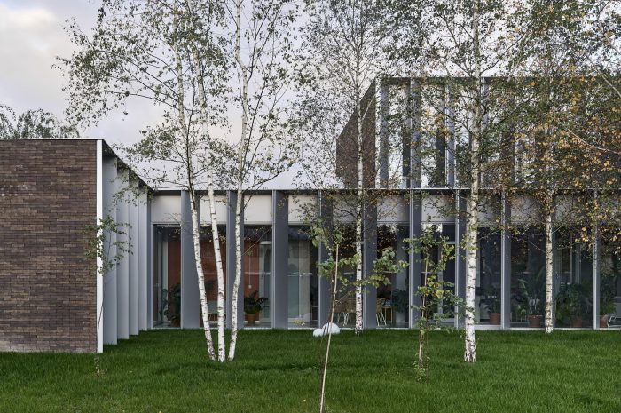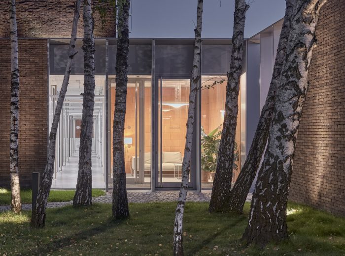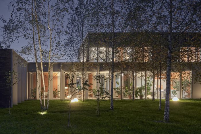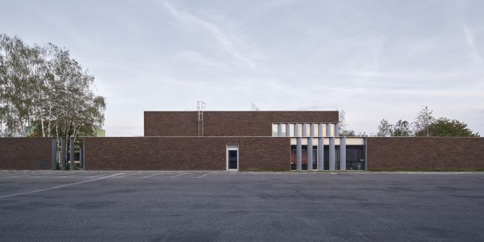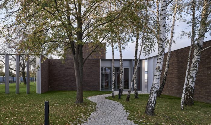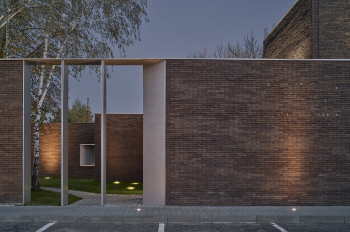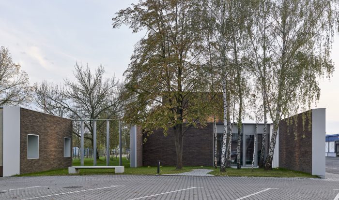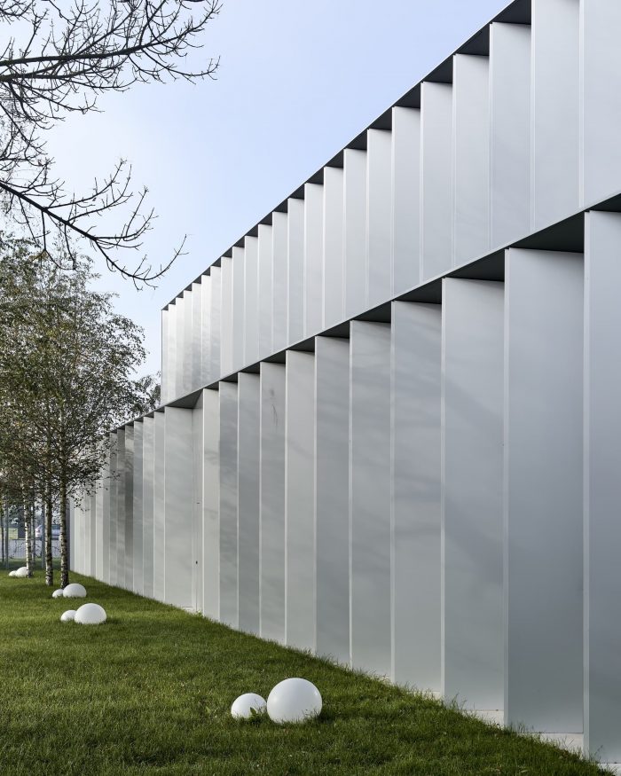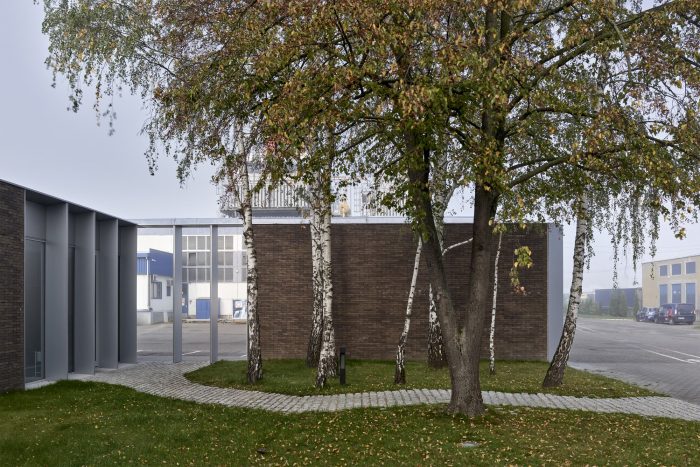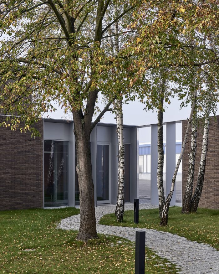 The new building splits the existing green area into three parts, to which the northern, southern, and eastern façades are looking, but especially towards which the boundaries of the building are extended by thick walls. These create exterior enclosures that act as a buffer between office and industrial work, generating the feeling that beyond the building everything is green, forgetting the environment around us. The latter is enhanced by the use of a nontypical industrial facade material such as brick.