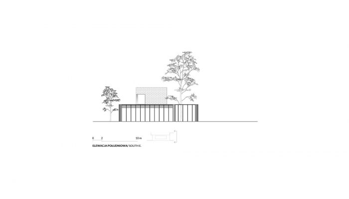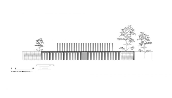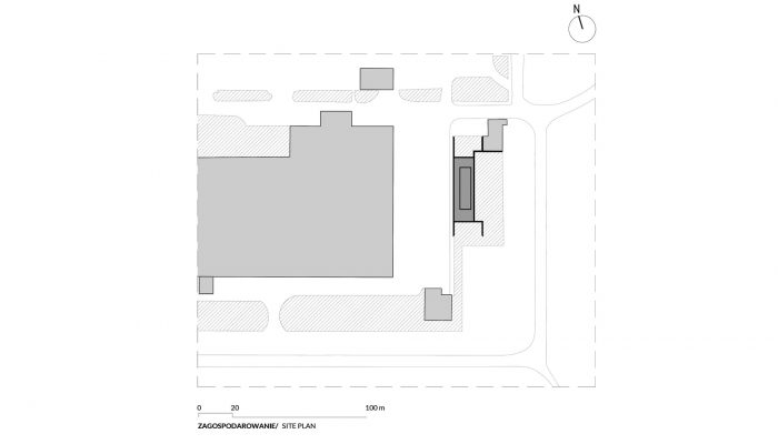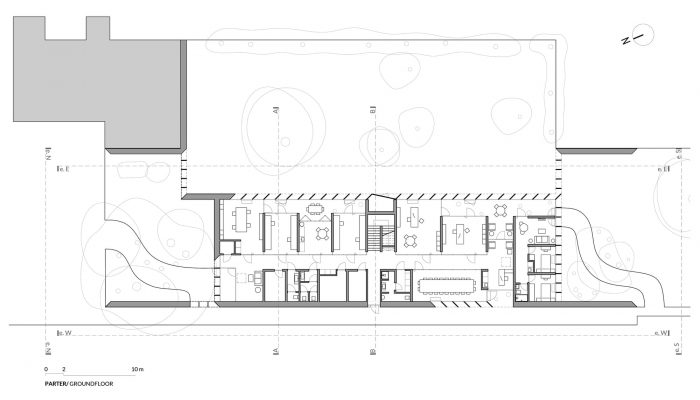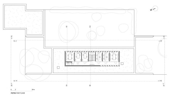 A smaller part of the program is distributed on the second floor to occupy less of the existing green area. In this way, a volume of offices emerges, abstracted from the hostile environment thanks to the retreat of the entire perimeter.