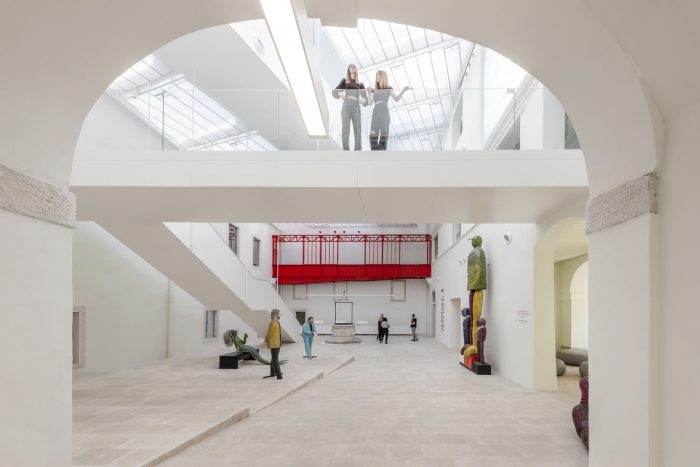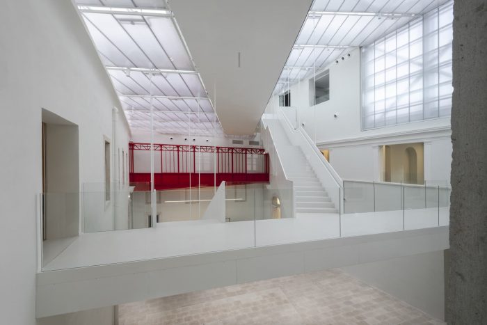 This is because the original stone floor hides and protects ancient containers, which now serve as water tanks for sprinklers. In addition to the stone floor, the old well cover has also been preserved. Two bridges cross the open space of the atrium, one newly constructed, and one found on-site in the process of renovation. These two bridges link the two diametrically opposed concepts of the palaces’ respective interior organization. One of the two bridges, a former balcony, is accentuated by its bright red color and has become a kind of trademark of the Palace.