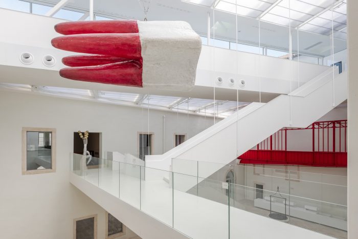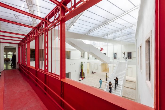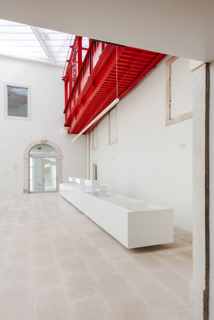 This ancient steel framework was discovered during the renovation process, under layers of plaster. An engineering gem, the bearing structure is a design particular to 19th-century architecture in Dalmatia. Although intended for demolition in the original renovation plans, the architects recognized the value of the structure and decided to keep it. The steel floor of the red structure now contains a ramp, suitable for visitors with disabilities, and it has taken over the function of a bridge connecting the two palaces. Due to its intense coloring, the constructive element has now become a sculpture as well — a dynamic red element in a monochromatic atrium.