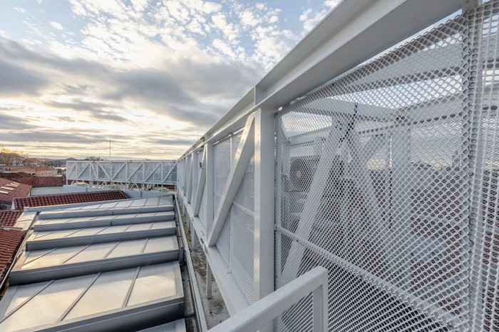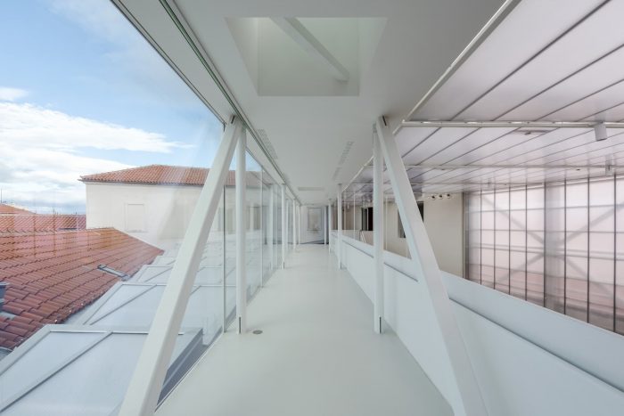 Moving from the overwhelming whiteness of the abstract space, the visitors can climb up to the highest level of the glass corridor where they will find themselves exposed to the blues of the sky and the reds of the surrounding Zadar rooftops. From a kind of belvedere, the city now becomes another exhibit on display. A steel grid placed on the roof of the complex is the technological, communication, and construction backbone of the structure, crucial for the building’s viability. It hides all the installations necessary to meet the requirements in a complex envisioned for such diverse purposes, such as numerous built-in air-conditioning units, ventilation channels, and supporting infrastructure.
