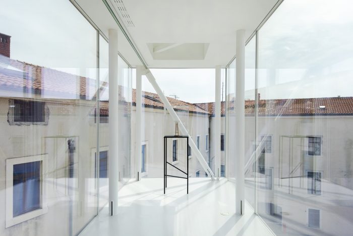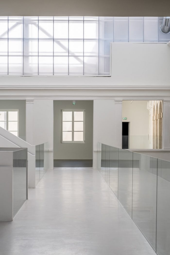 The large atrium of the Providur’s Palace, a former open space, has become a covered passage, a central zone connecting the two buildings. The spacious multilevel volume of the atrium is the most monumental part of the complex and has taken over the crucial function of being the main entrance and exit as well as the space from which a visitor can approach every section of the Two Palaces. By means of the visible overlap of historical layers and new architectural elements in the atrium, the encounter of the old and the new has been made most apparent. The space is dominantly white and the light coming through the translucent polycarbonate roof draws the visitor’s eyes upwards, to the steel framework. The steel framework extends into large white staircases which cut through the space of the atrium-like feelers, lightly touching the ground they cannot lean on.