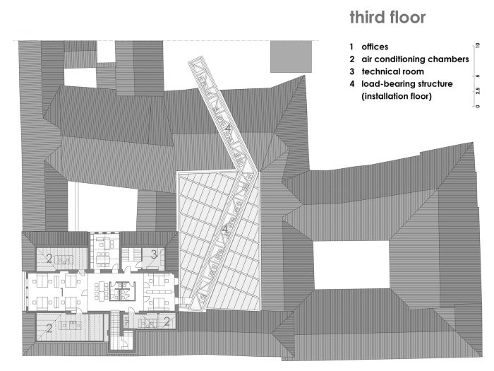 This surprising parasite penetrates, connects, and revives the historic structure it leans on, hiding all of its technological equipment while leaving its fifth facade intact. The old stone relics, the two palaces, have thus been connected to a machine that “keeps them breathing” — an architectural superstructure concealing new layers which the original palaces were never intended to incorporate. This structure also performs a major tectonic function: the steel grid, leaning on the palace walls, supports the translucent roof of the atrium, the staircases, and the glass corridor with its scenic view.
