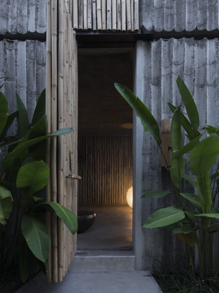 由于其偏远的地理位置,设计刻意依靠传统材料和建筑技术,同时提供一个强大的概念框架。了解到混凝土是巴厘岛首选的建筑方式,而竹子又多,因此在现场搭建了一系列竹子形成的混凝土墙体,创造出中间和内部的条件,框定了山和海。
