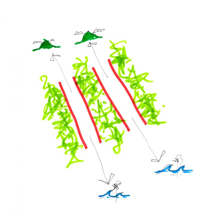 The materiality of this project aims to work within the local context, construction techniques, resources, and climate; a rugged regionalism. Concrete and bamboo are abundant, so it was best to work with these materials throughout. In a tropical climate, a clean finish would require much maintenance, here, the material will weather in, enhancing the character of the architecture and place. Importantly, this also became the finishing. Expressing the texture and form of the bamboo as a negative impression in the patina of the concrete becomes this project’s motif.