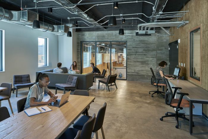 The design derived from the company’s vision statement: “theatre—done well and with passion—can transform lives and communities” and resulted in the performance space thought of as the “beating heart of the building.” The theatre was left exposed with a concrete envelope, visibly expressing itself on all sides – from the exterior, into the commons, and into the back-of-house corridors – letting the people locate themselves in relation to this building’s “heart.”