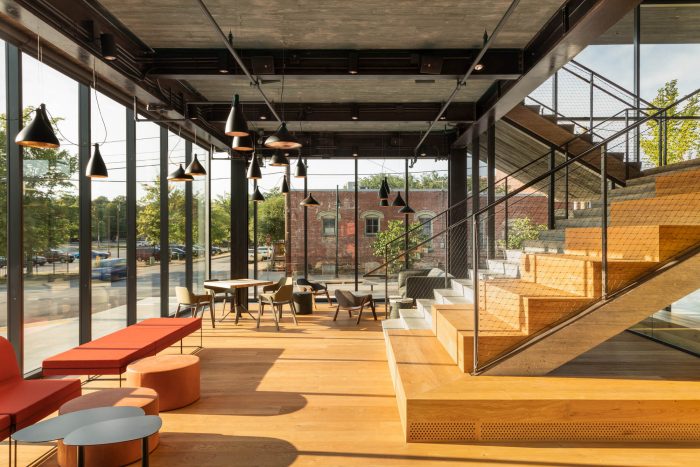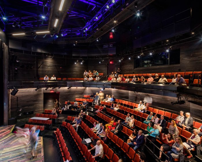 Working with theater consultants CharcoalBlue, Marvel created state-of-the-art mainstage and studio theatres capable of mounting complex, technically challenging productions situated within acoustically soundproofed envelopes, a crucial consideration due to the nearby active railroad tracks. TheatreSquared’s previous extra-wide stage shape was replicated in the new main theatre while audience capacity was increased by adding a wraparound balcony level while the back row of the orchestra level became only one row deeper than the original space. Audience members enter at the stage level, the same level as the actors – another experiential element that was preserved – further heightening the personal theatre experience that has become a hallmark of TheatreSquared’s performances.
