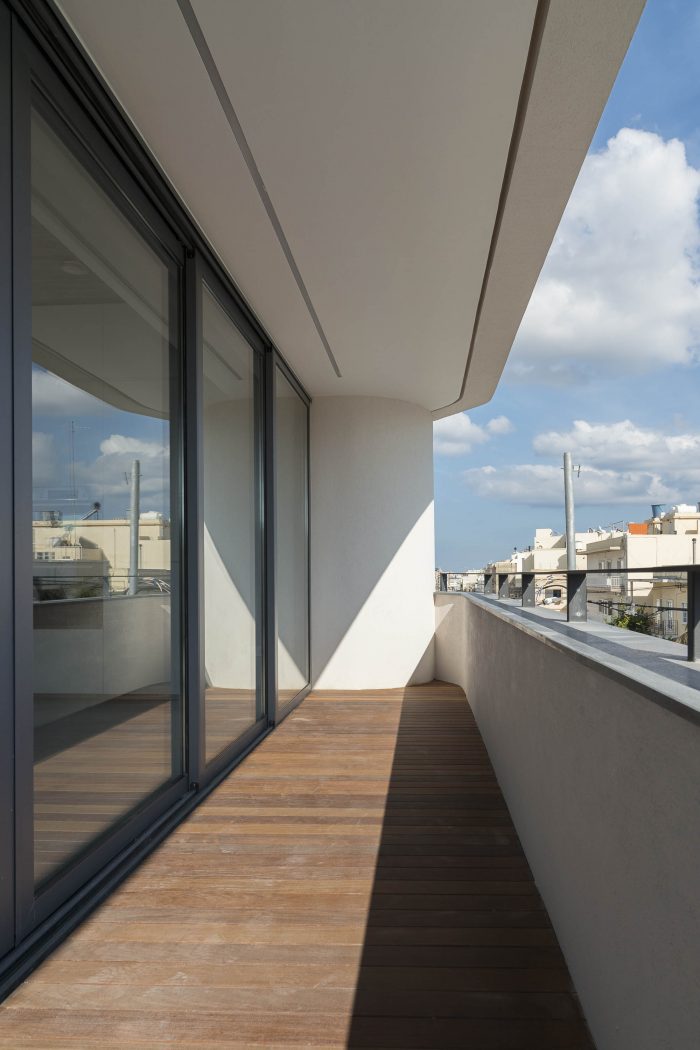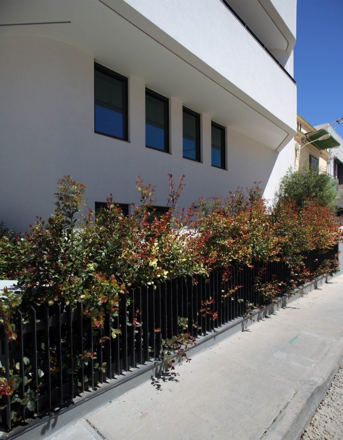 大面积的推拉窗和深凹的露台包裹着上层简约的外立面,而其硅酸盐饰面既支持热效率,又庆祝明亮的地中海光线--让人想起漂白的沿海建筑传统。该建筑独特的曲线造型与街道的衔接紧密结合,沿着转角处巧妙地弯曲。凸出的露台为低层创造了宝贵的遮阳,并最大限度地扩大了内部居住空间的面积。在街道层面,建筑周边树木林立,为隐藏在地下半地下一层的办公空间提供了私密性。