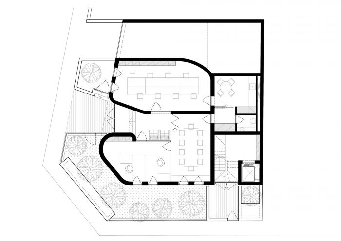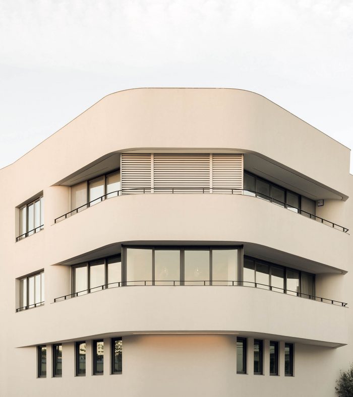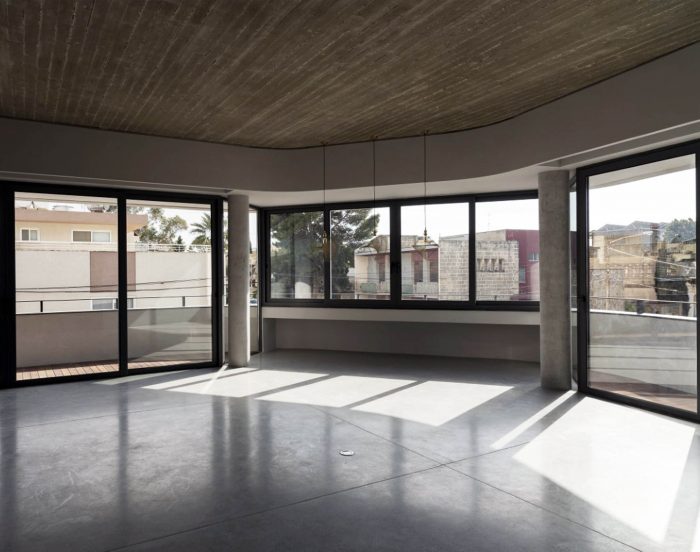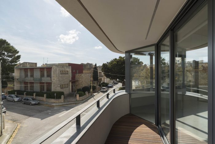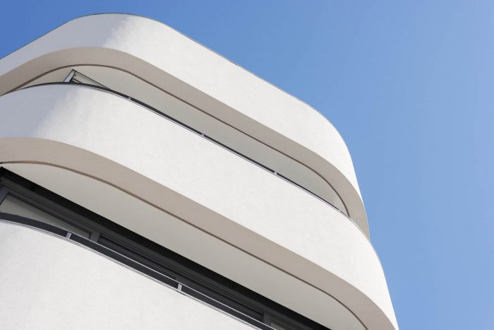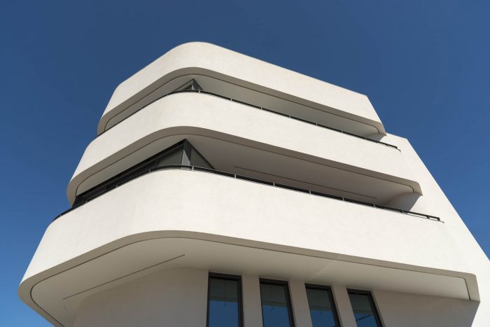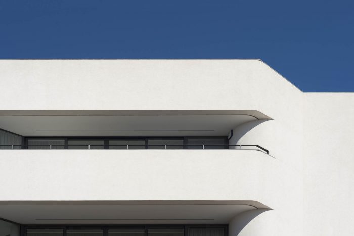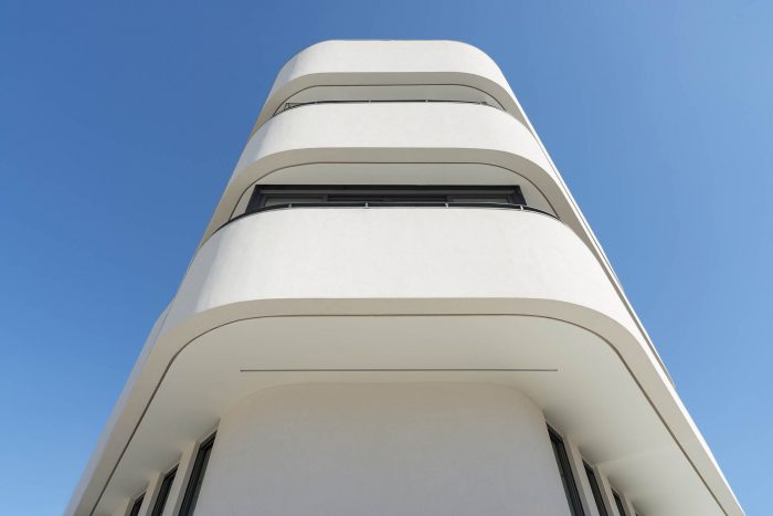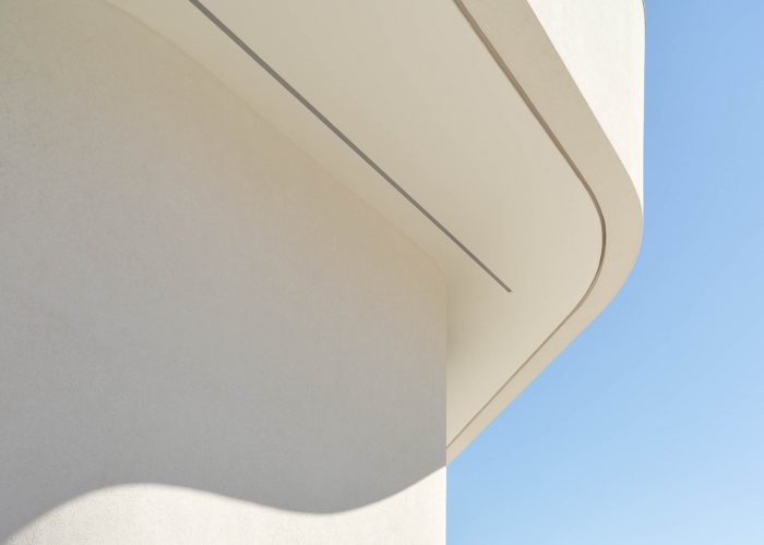 Large, sliding apertures and deeply recessed terraces wrap the spartan facade at upper levels, whilst its silicato finish both supports thermal efficiency and celebrates bright Mediterranean light – recalling the tradition of bleach-white, coastal architecture. The building’s distinct curved form works cohesively with the articulation of the street, bending subtly along its corner site. Its projecting terraces create valuable shading to lower levels and maximise the size of the living spaces inside. At street level, the building’s perimeter is lined with trees, lending privacy to the office space tucked within the semi-basement level below.