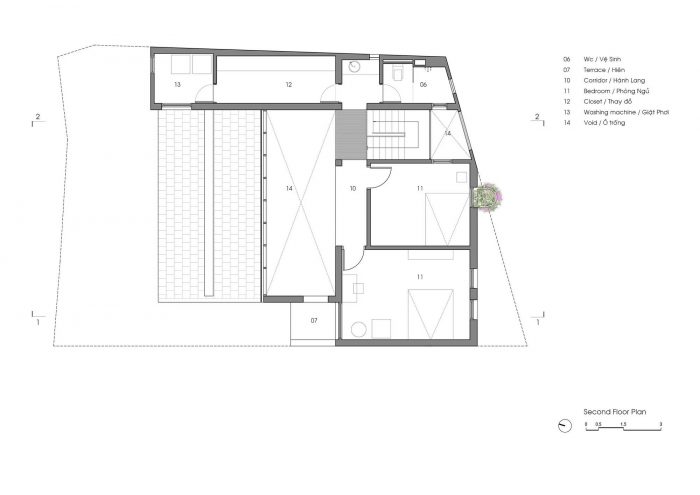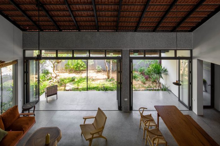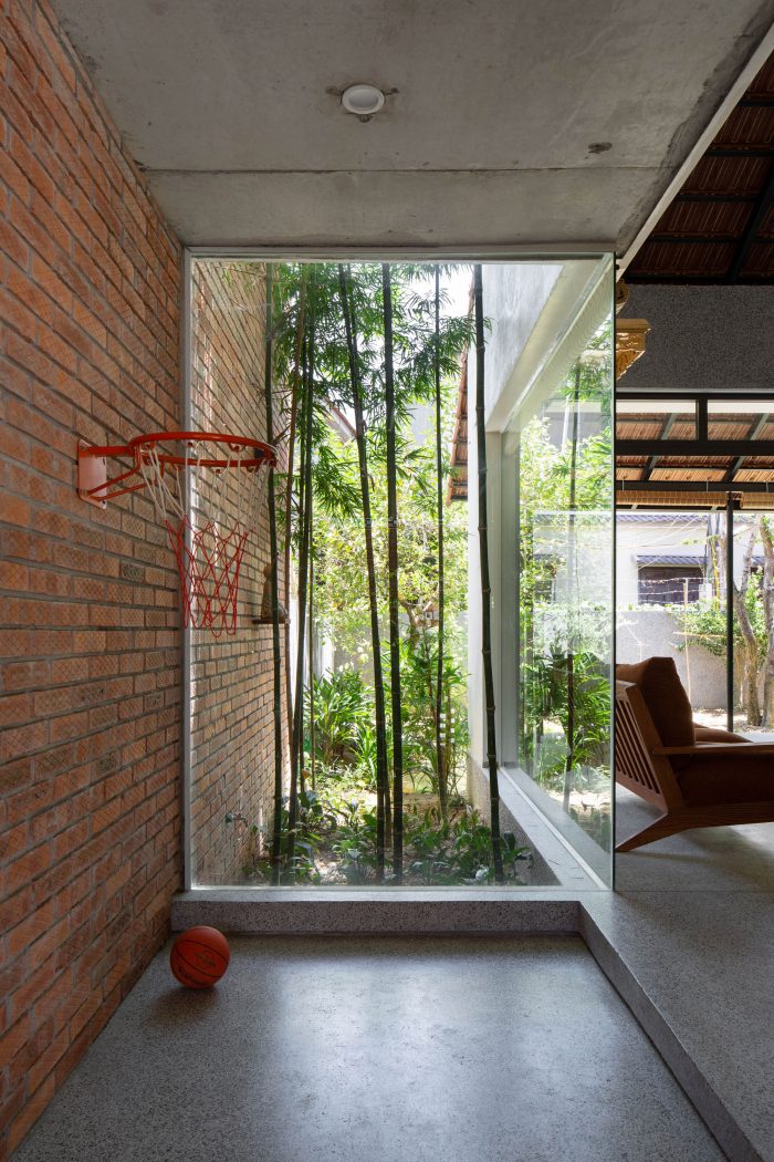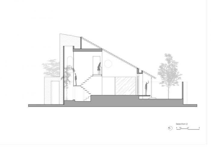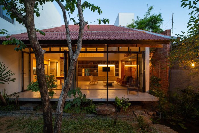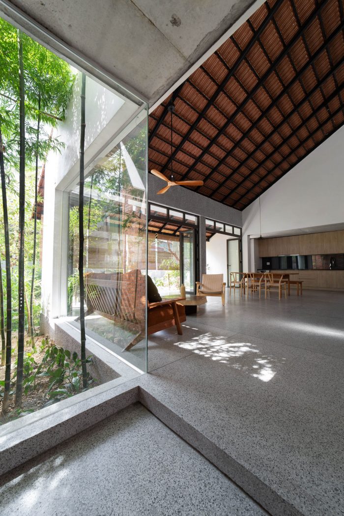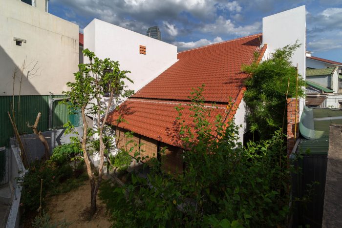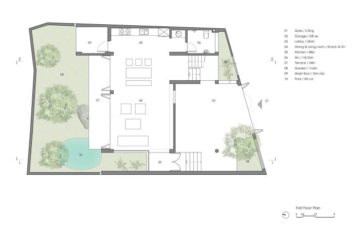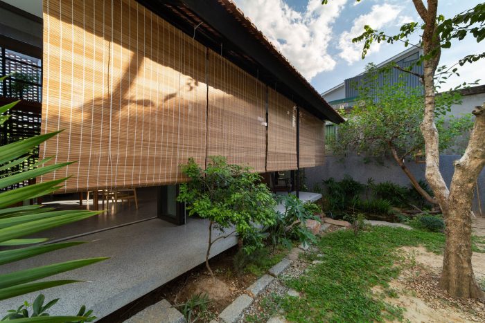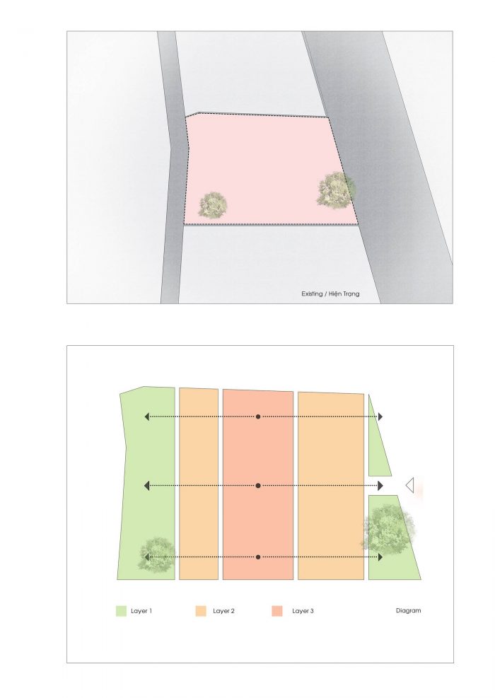 An idea of a multi-layered space, spreading from the outside to the inside and from the inside to the outside is gradually formed. The spaces are classified and arranged into horizontal layers of the site from outside to inside, including the first layer are auxiliary spaces such as a garage, toilet, stairs and small gardens, the garage now acts as a large front porch for the main space to recede, the second layer is the main living space includes the lobby, kitchen guests, the third layer is an extended porch, the last layer is a garden with many trees and a small aquarium.