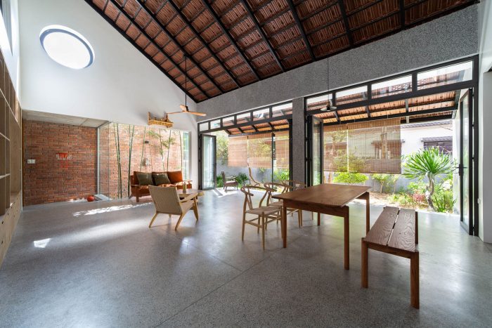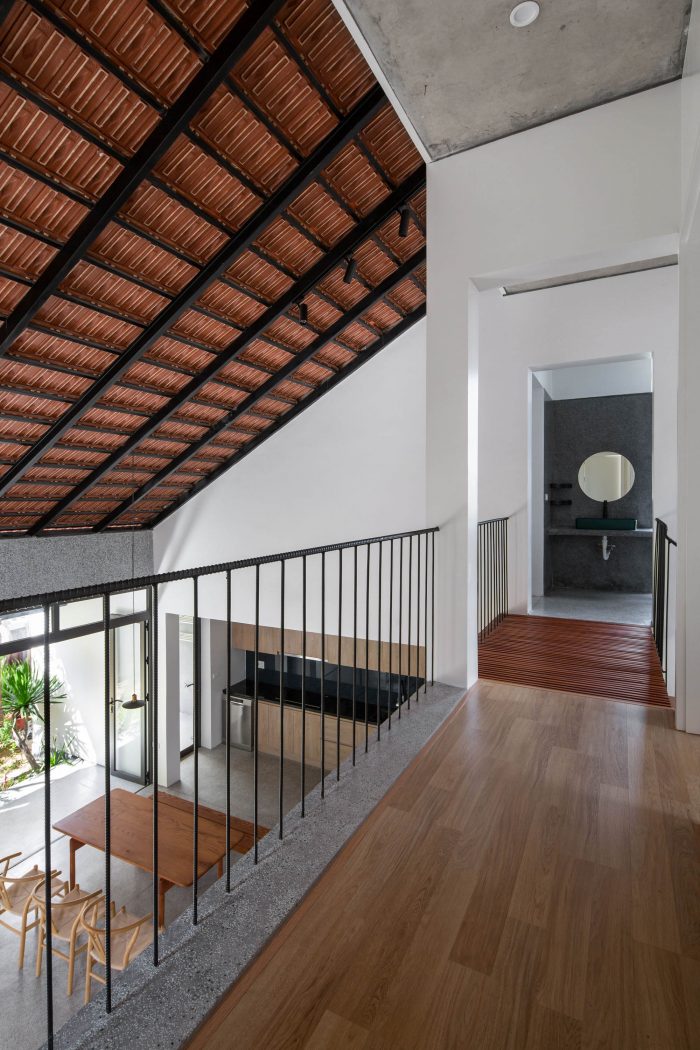 With such an arrangement of space in layers that will create a depth of space for the house, the common living space block is the centre that opens up to maximize natural ventilation through long verandas. but indirect natural light entering the space is also moderate, more suitable for living space. The 2nd floor is designed to be minimalist with sleeping blocks and auxiliary space blocks, optimizing the use area. These two functional blocks are connected by a system of iron stairs, and the wooden bridge is airy, light and interesting.