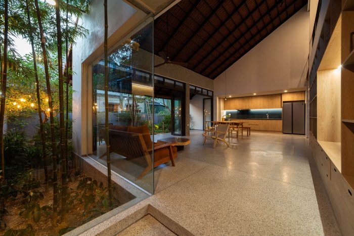 The design of the elevation for the house is carefully studied and calculated when the extreme weather causes flooding every year more and more, but it must still be following the general planning of the city. The front garden garage space is raised not too high, just enough for easy access, then the main house space is raised higher and is transitioned by stairs with few steps, this solution helps The whole main space is safe in the rainy season but still harmonizes the inside and the outside of the house. In addition, the views from inside to outside and from outside to inside are also more interesting.