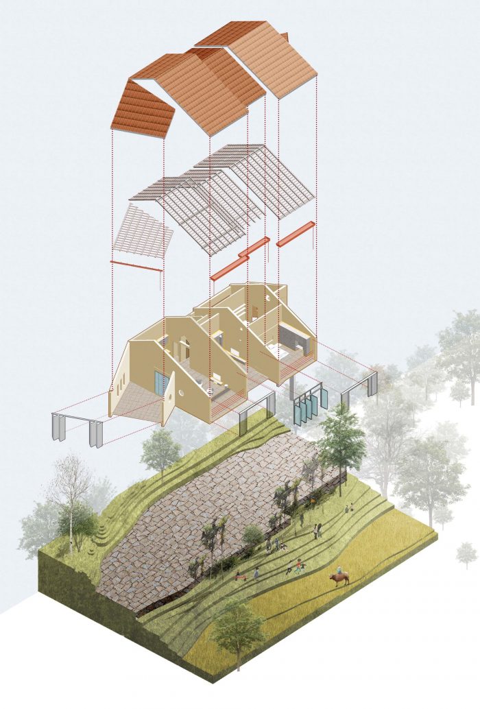 Tien Cam's house is situated on a slopes hill in a peaceful rural area, surrounded by mountains, overlooking orchards, flowing streams, and fertile fields. On the land is an old four-level which the son wants to demolish to construct a new house for his parents as a present and it’s also a place for family members who work far away to return to rest on special occasions.