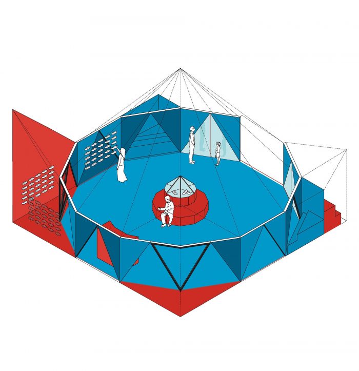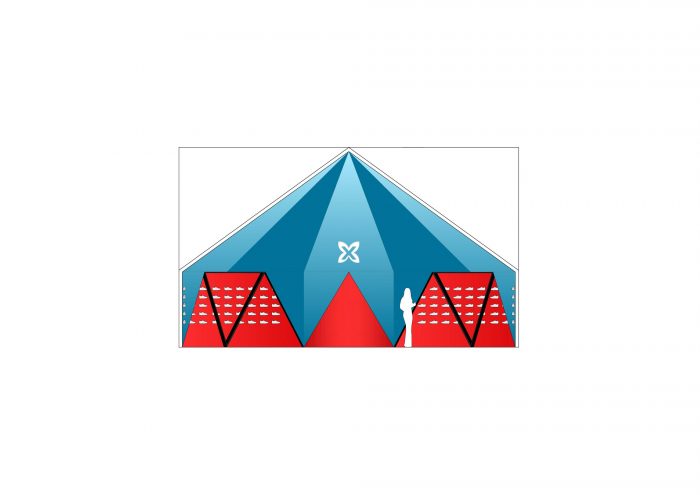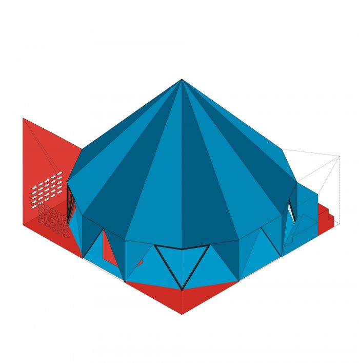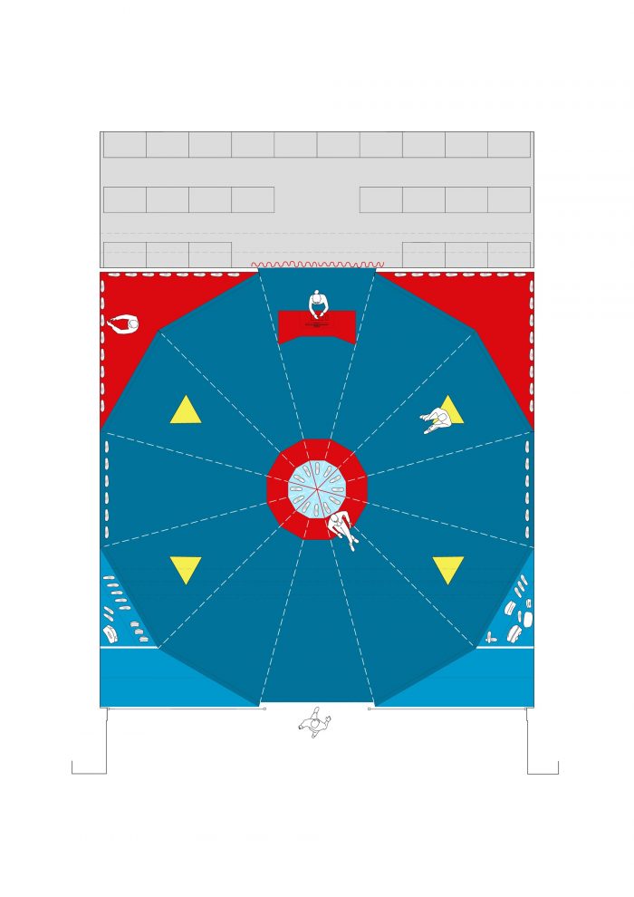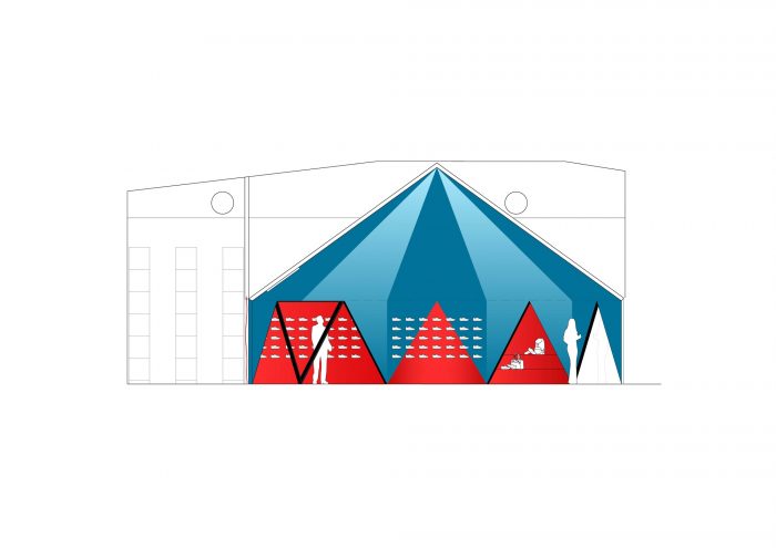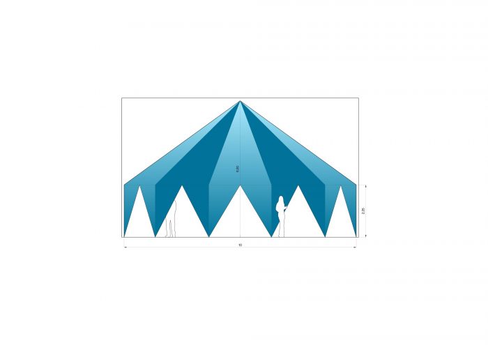 帐篷,这个名字和它的使用是一个文字游戏,就像一个笑话:它是一个帐篷,让人联想到一个帐篷或马戏团结构。它的外观是紧绷而轻盈的,但它的结构是僵硬而沉重的。它是巨大的色彩,但它是不透明的。它过于天真,但又刻意地概念化。