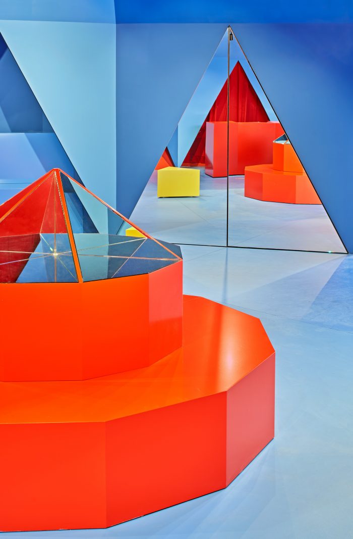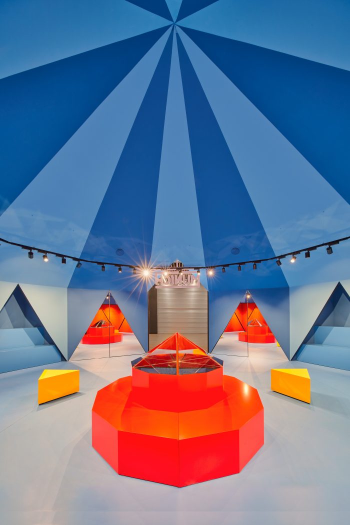 店面所在的处所是一个10×10米的正方形,这个金字塔的顶端是一个规则的十二边形。每一个侧面都有特定的用途,而金字塔周边之间留下的空间则成为了店铺本身的专门区域:两个红色的角落专门用于特殊的折扣,两个壁龛用于放置包包和配件,入口两边有两个店铺窗口。在中央,一件十二面的家具就像一个万花筒,展示着品牌最新的新品,同时又与覆盖在它上面的金字塔形成多重反射。