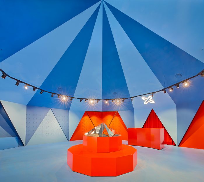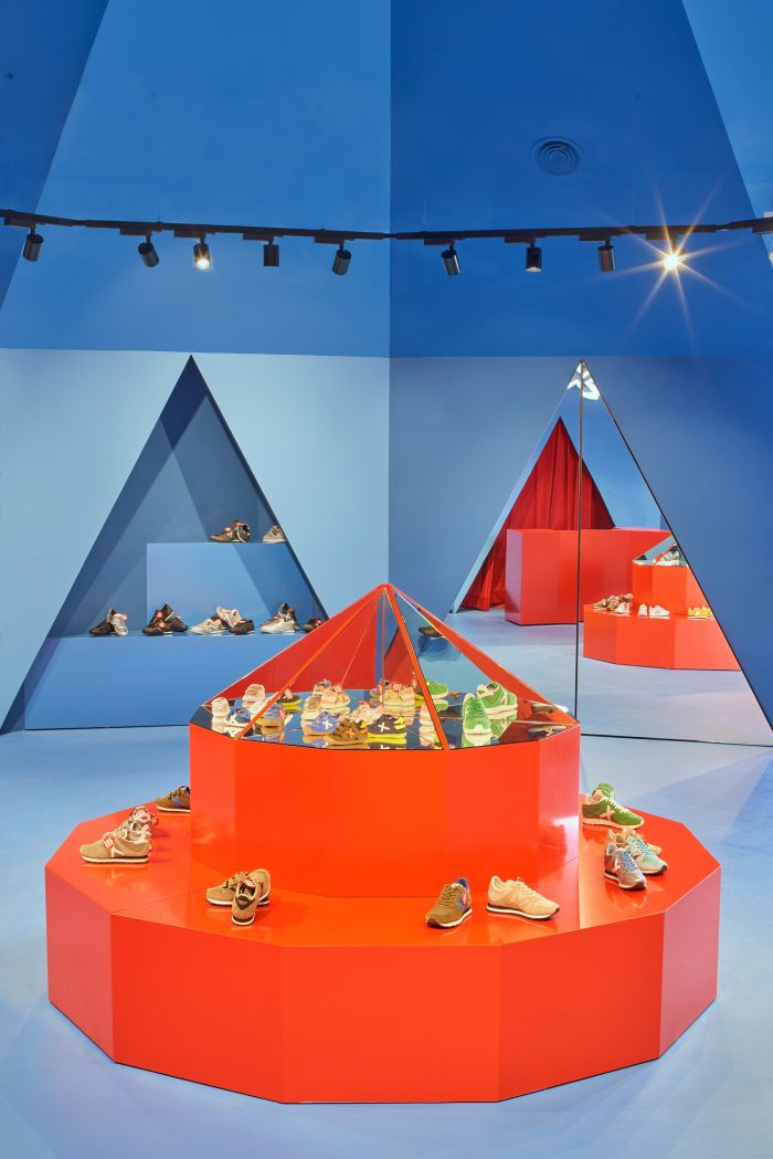 Tent is a geometric, faceted and symmetrical space. It is the inside of a twelve-sided pyramid and the volume of atmosphere it generates makes this place more than just a shoe store.