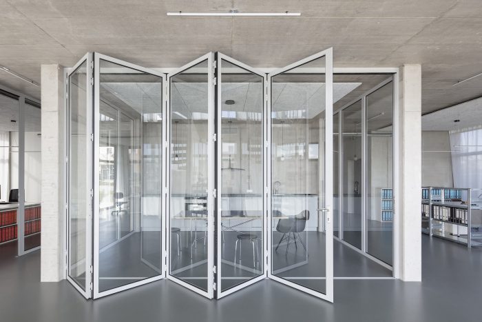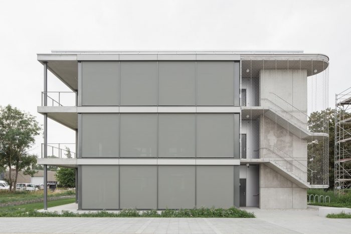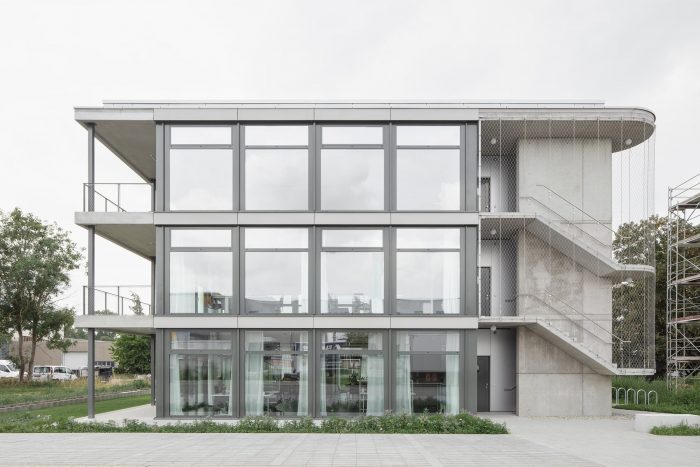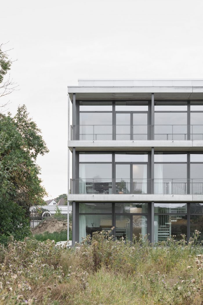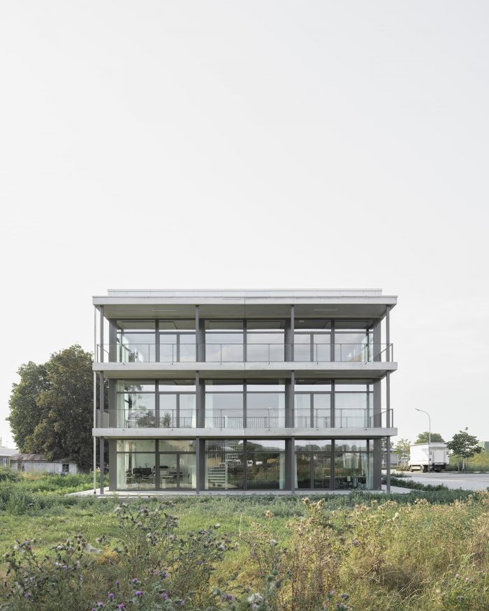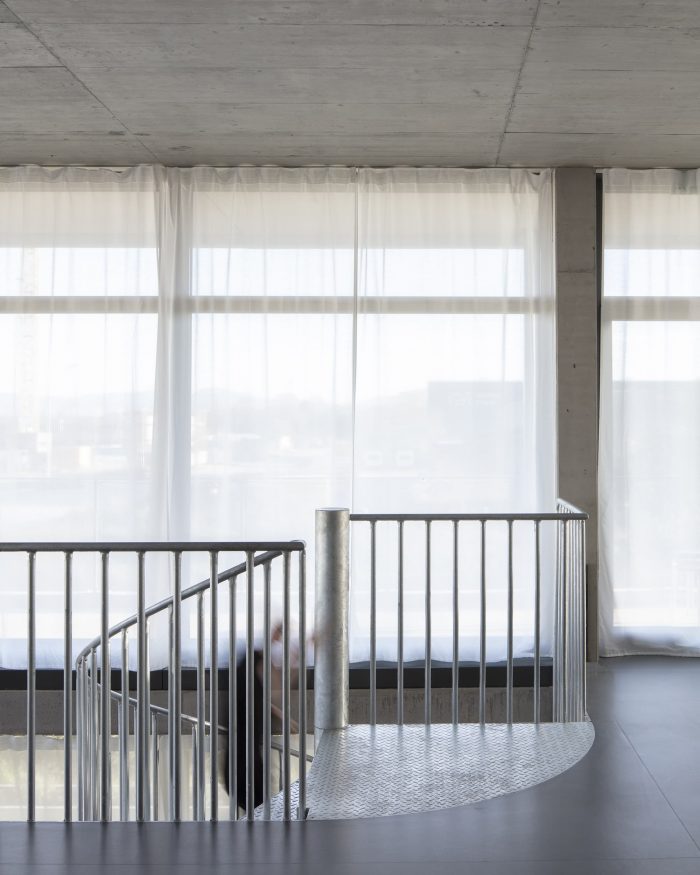 The building zones are visually connected by the continuous horizontal façade bands, which also accommodate the textile sun protection. Inspired by the commercial context, all components of the building are planned in industrial quality and the interior is designed as a refined shell. On the other hand, there is a high proportion of glass in the façade, which is untypical for commercial areas. Curated by the use inside, this should create communication and revitalize the surrounding commercial area.