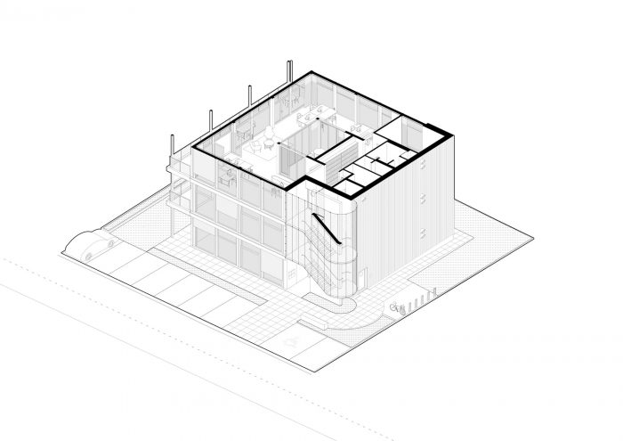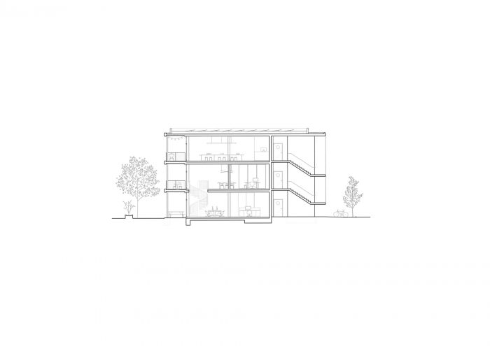 城市主义。根据物业的几何形状和未来新商业区的选择性周边发展,开发了一个独立的三层楼的接龙。为了在长期内实现灵活的办公室和公寓大小,甚至超过实际楼层,从而也为了在以后将目前计划的两个使用单元分离成三个,在东北方向的外部开发,面向通道,被整合。突出的半圆形楼梯平台打破了体量的清晰几何形状,标志着各个单元的入口,并作为周围城市空间的沟通者。通过北侧立面的贯通式电梯,也可以从外面进入无障碍通道。