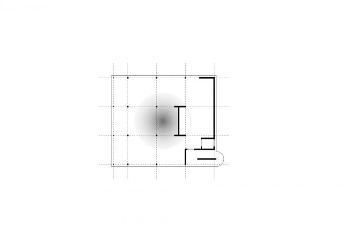 空间概念。与功能概念相一致的是,厕所、储藏室和技术等服务房间被安置在封闭的北墙上。所有的工作区域都围绕着厨房的中心,作为一个交流的场所。南部的室外区域用于放松、非正式交流和作为临时工作场所。