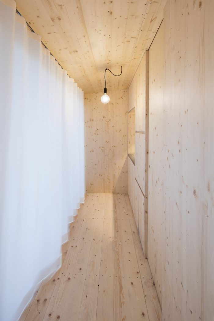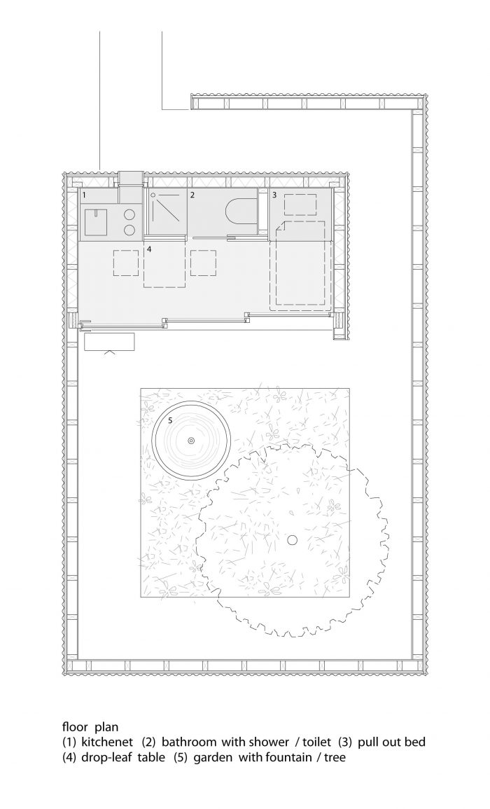 室内与外界隔绝,只有一个螺旋形的入口好奇地通往室内。微型庭院住宅仅有7.3平方米,包含所有需要的设施。浴室、橱柜和厨房的深度为85厘米,沿着主墙布置,主墙还设有一张可折叠的桌子和床。沿着这面墙的一个方形窗户将生活区与外部世界连接起来。在这一面的对面,一扇横跨整个房屋长度的长玻璃门将生活空间与宁静的花园松散地分开。