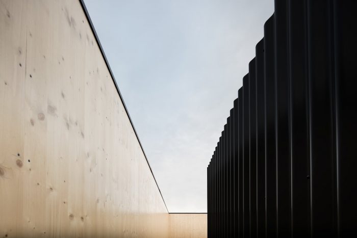 The cozy atmosphere of the inner wooden wall contrasts the dark corrugated iron sheets of the external facade. The juxtaposition between inside and outside, open and closed, noise and quiet, privacy and public, enriches the architecture. It thus becomes clear that the Micro Courtyard house is an ideal solution to utilizing minimal space, even the most unusual ones. Despite being situated in a tight and hectic space, one can still escape from the busy world and gaze into the open skies.