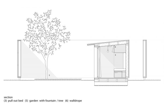 The interior is secluded from the outside, with only a spiral entrance leading curiously inside. At merely 7.3 square meters, the Micro Courtyard house contains all of the required utilities. The bathroom, cupboards, and kitchen have a depth of 85 cm and are arranged along the main wall, which also features a foldable table and bed. A square window along this wall connects the living area to the outside world. Opposite to this side, a long glass door spanning the entire length of the house loosely separates the living space from the tranquil garden.