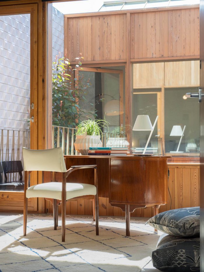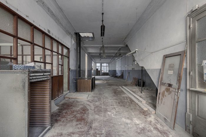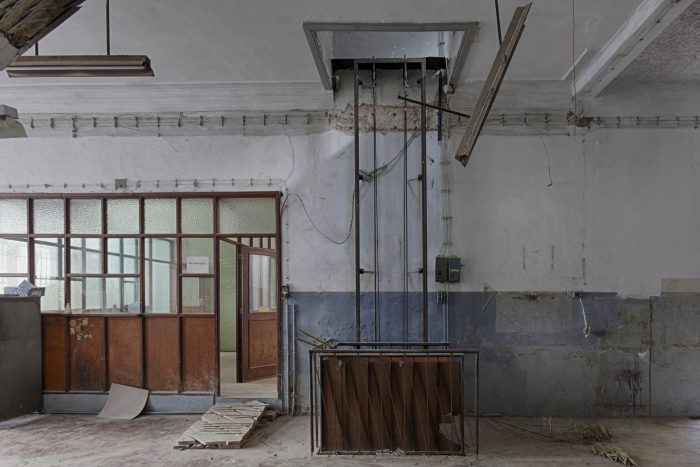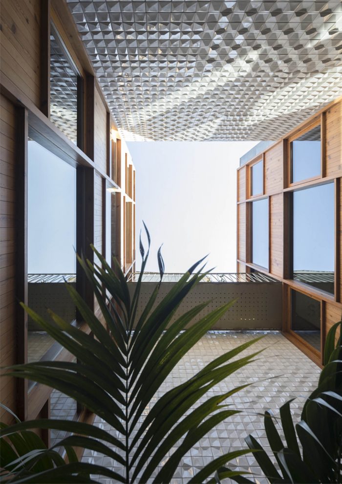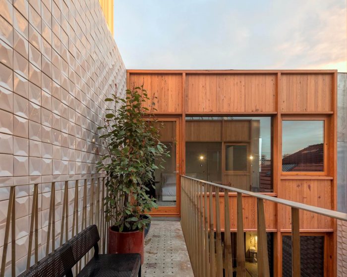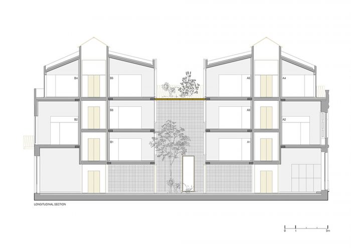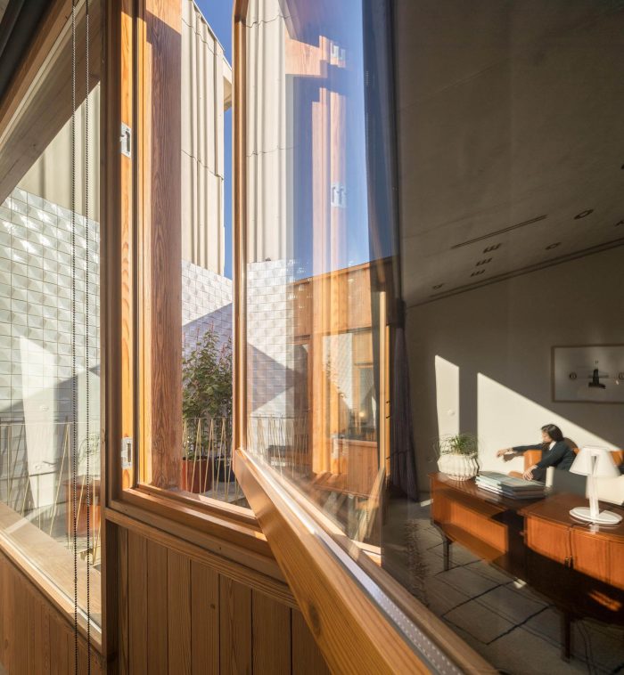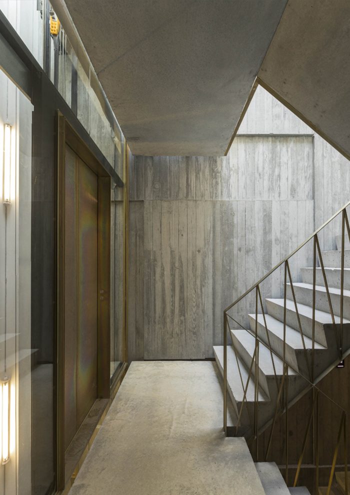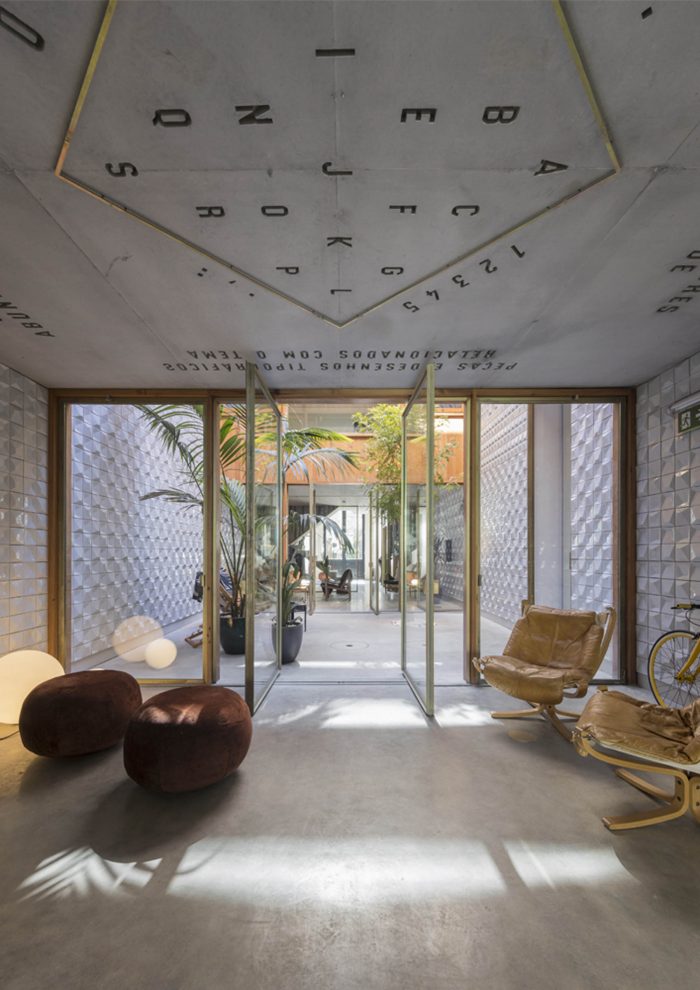 In general terms, concrete (liquid stone) is the basic element of this project. Concrete is moulded or finished in three kinds of textures: “smooth” for ceilings and pavements; “striped” for the interior walls; and “rough” for the back facade. Inside, the concrete is accompanied by punctual elements in golden metal – in the decoration of ceilings, stair handrails and elevator columns – creating a desired contrast between roughness and refinement. In the central courtyard, another relationship is established between the new wooden facades, evoking the typographic plates that existed there, and an abstract carpeting of white tiles on the sidewalls, which reflects the light. All common areas prolong that contrasting relationship between the exposed concrete and the gilded metal surfaces, between new details and recycled furniture objects.