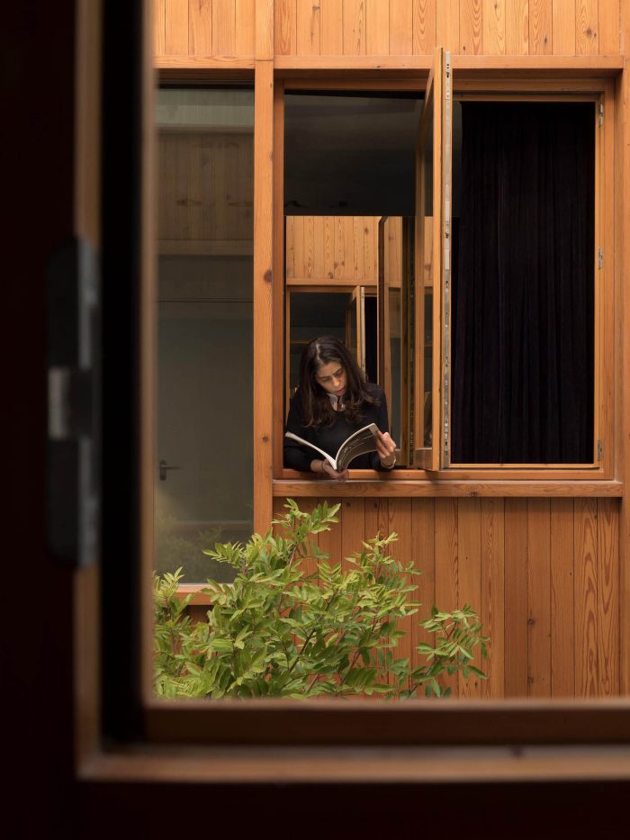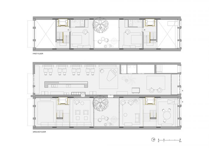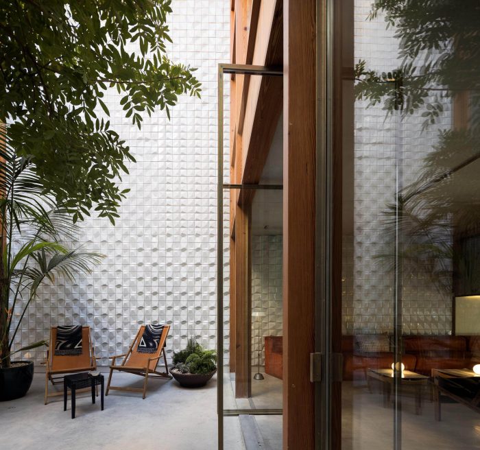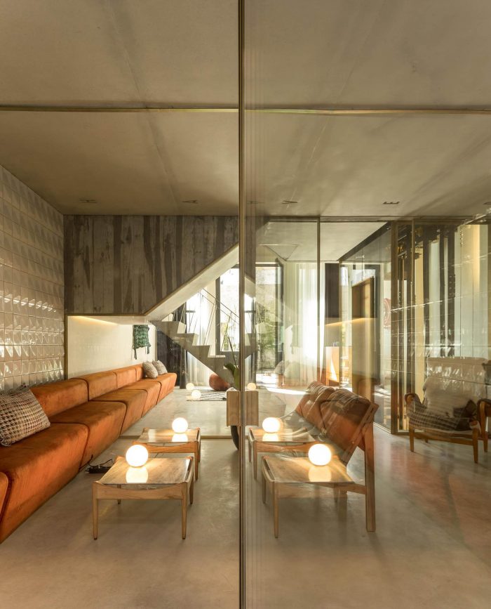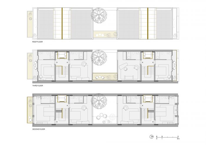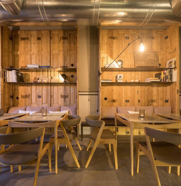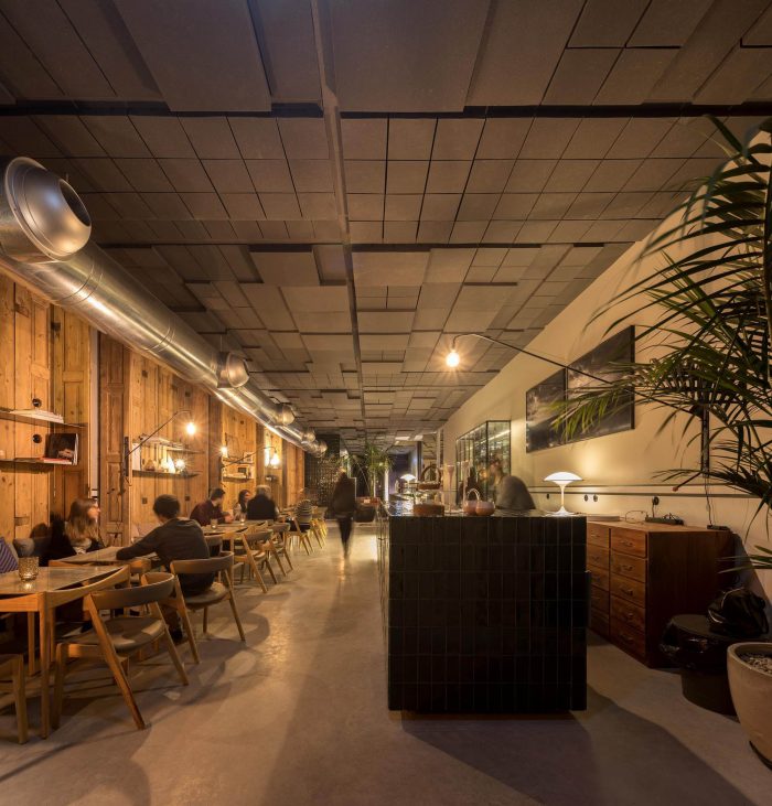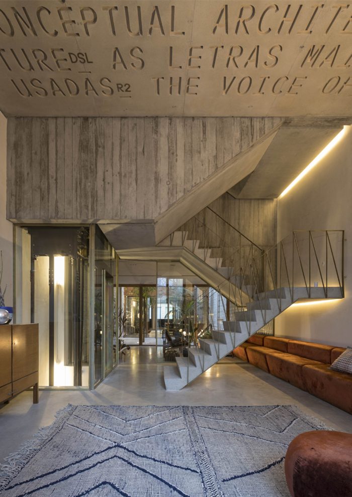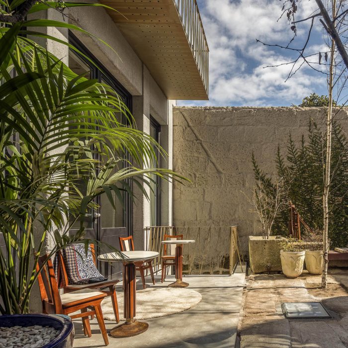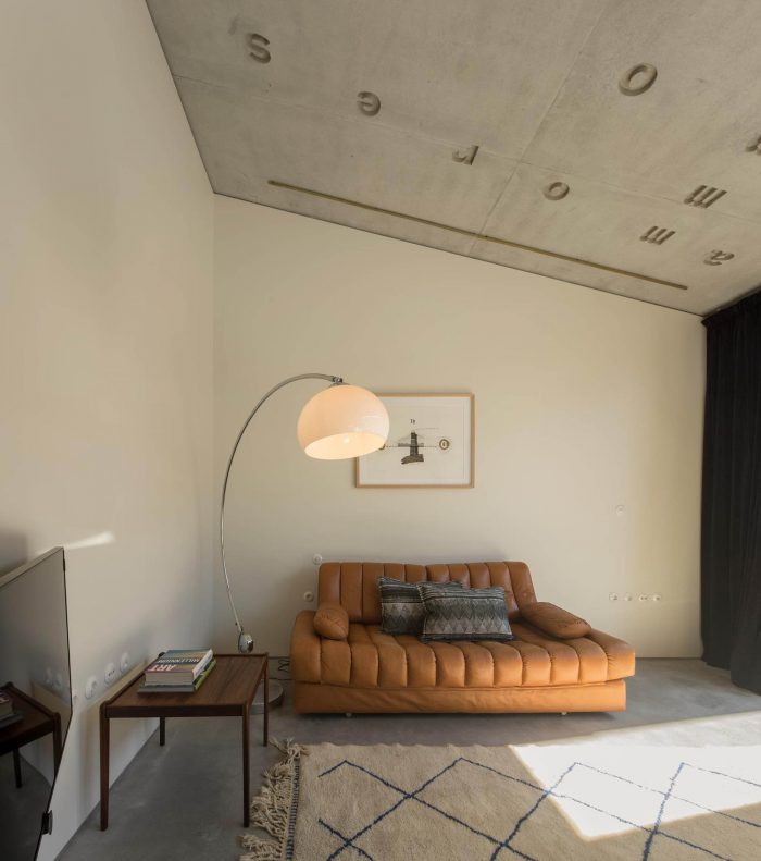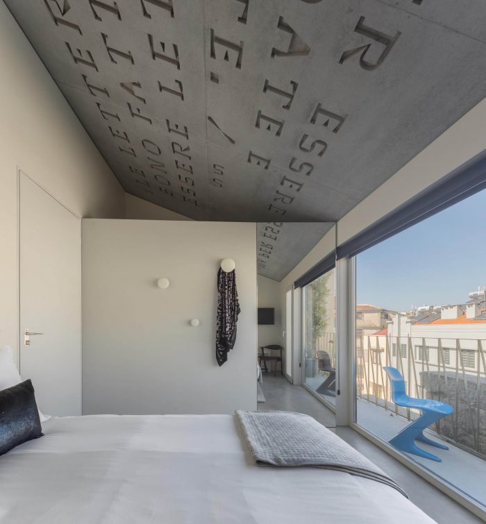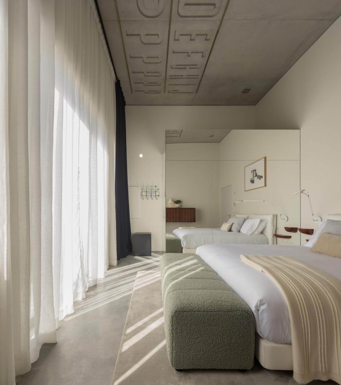 The Hotel rooms recall the old Workshop ambiances: in the proportions of the ceilings; in the way the glassed toilets’ cabinets are placed in the space; in the echoes of the elegant wood surfaces. All rooms are covered by specific scripts, written by ten selected authors, from writers to designers or architects. The scripts are converted into typographic text(ures) and inserted on the surface of the concrete ceilings. Punctual golden metal shears stand out from the ceiling backdrops, enriching the reading of those scripts. The ground floor, which includes a wide Cultural Café, remains a long and flexible space, giving access to the central patio and backyard. It is used as a “stage” for different cultural events intermediating between outdoor and indoor.