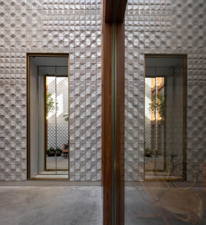 一般来说,混凝土(液体石材)是这个项目的基本元素。混凝土被塑造成或完成了三种质地。天花板和人行道是 "光滑 "的;内墙是 "条纹 "的;背面是 "粗糙 "的。在内部,混凝土伴随着金色金属元素的点缀--在天花板、楼梯扶手和电梯柱的装饰中--在粗糙和精致之间创造了一种理想的对比。在中央庭院中,新的木质外墙与侧壁上的白色瓷砖的抽象地毯之间建立了另一种关系,这让人想起了那里存在的排版,反射出光线。所有的公共区域都延长了裸露的混凝土和镀金的金属表面之间、新的细节和回收的家具物品之间的对比关系。