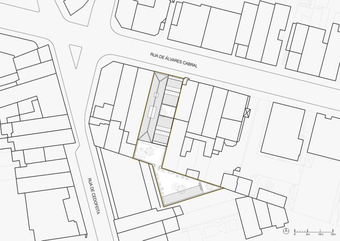 The project departs from an existing compound erected in 1916 to house small industrial activities (a Typography and a Graphic Workshop), which has since closed down. Over the last few years, the structure of the building has deteriorated, making it impossible to fully reuse it for the envisaged new functions. From this previous Workshop occupation, some memories remain at the new Hotel design: the main stone façade (in Deco style), the reuse of the central patio for lighting and ventilation, and its internal spatial flexibility, especially at the ground level.