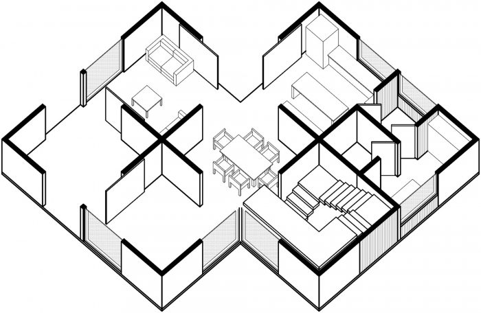 这个网格形成了三个主要的空隙:每个空隙都有一个特殊的目的,补充了室内空间、景观和露台。最后,它建立了房屋周围的自然风景和其结构之间的对话。
