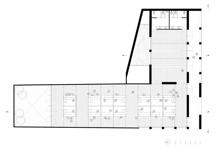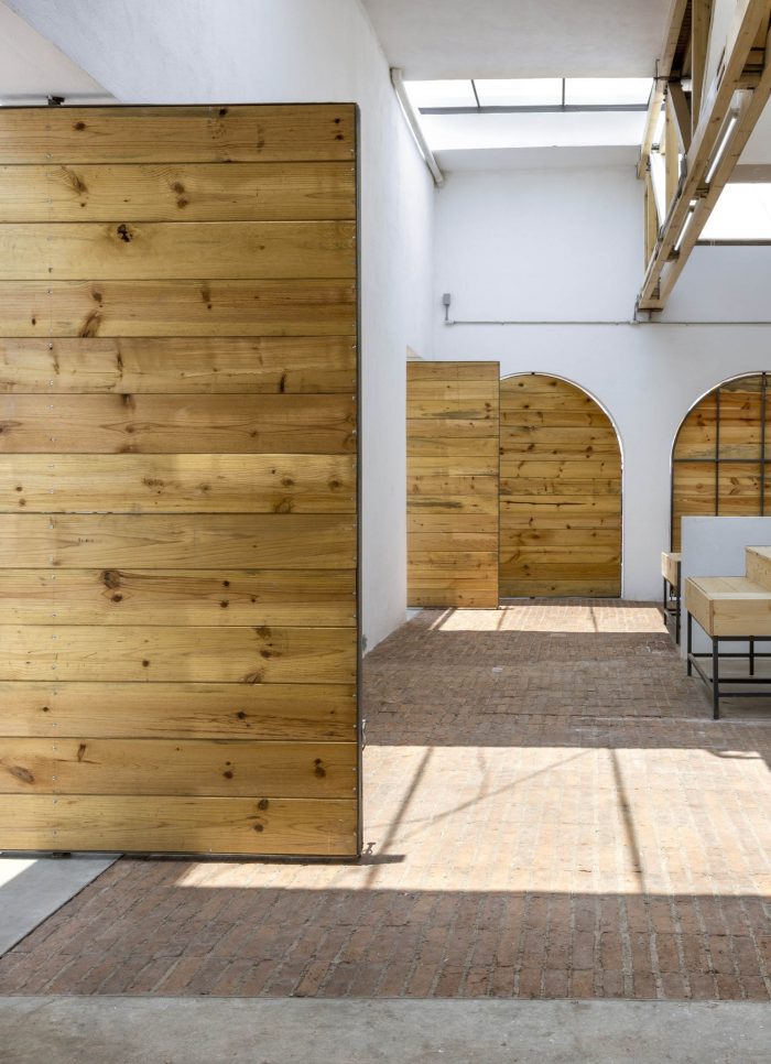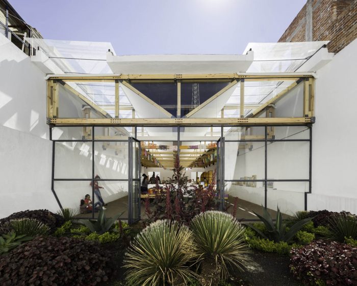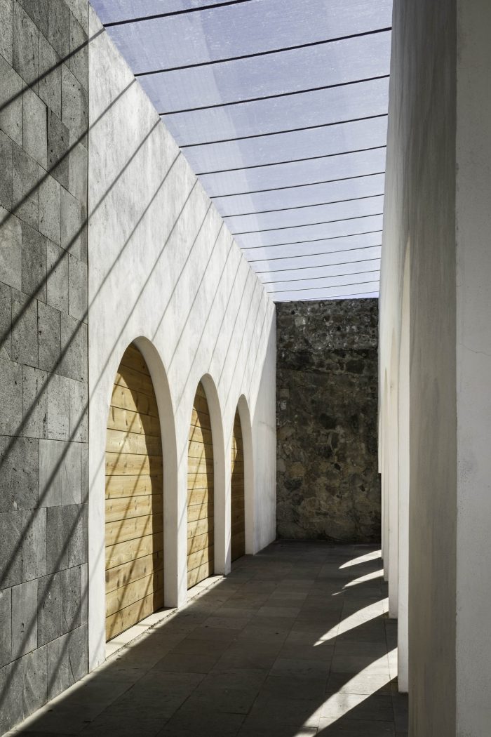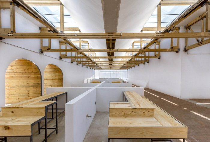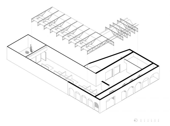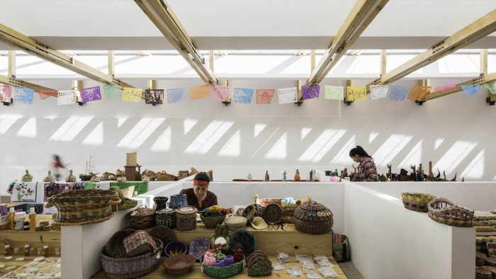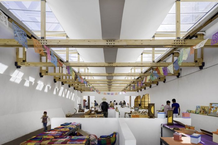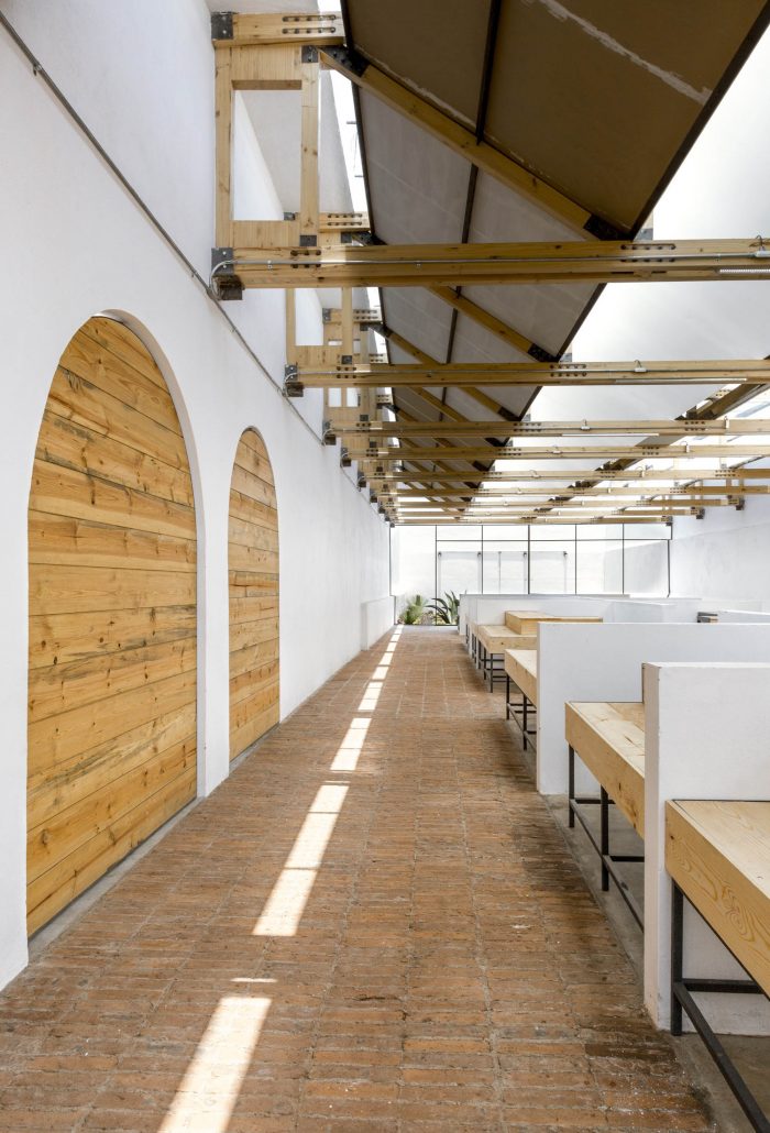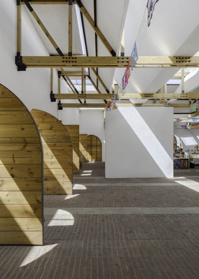 市场收回了一座废弃建筑的侧墙和地基,由两个中殿和一个前廊组成。上层的中殿容纳了14个场所,较小的中殿有一个给游客和学生举办研讨会的空间,每个空间都与一个天井相连,以备有必要将活动扩展到国外。走道由一系列的拱门和一个矩形框架组成,作为现代和乡土语言之间的对话,该空间作为一个会议点。