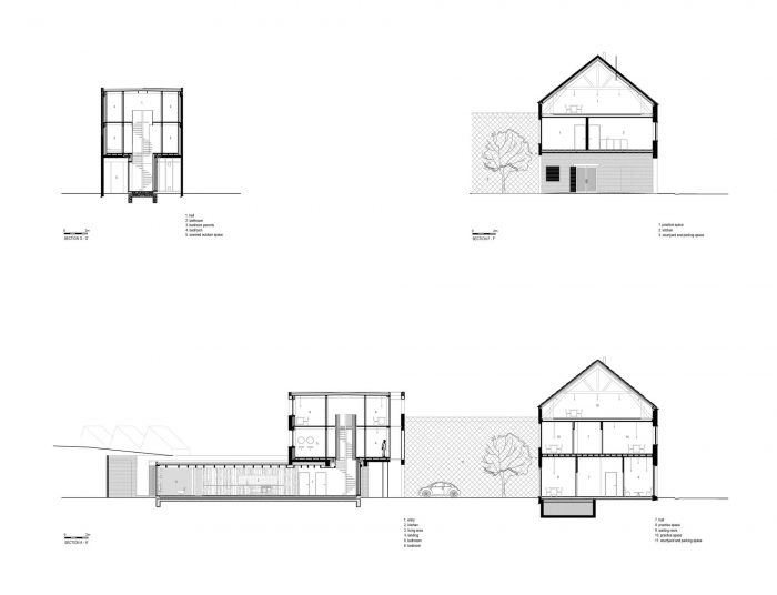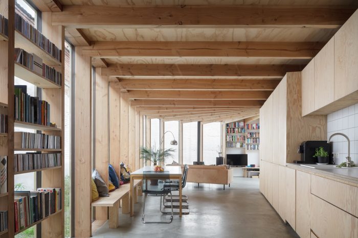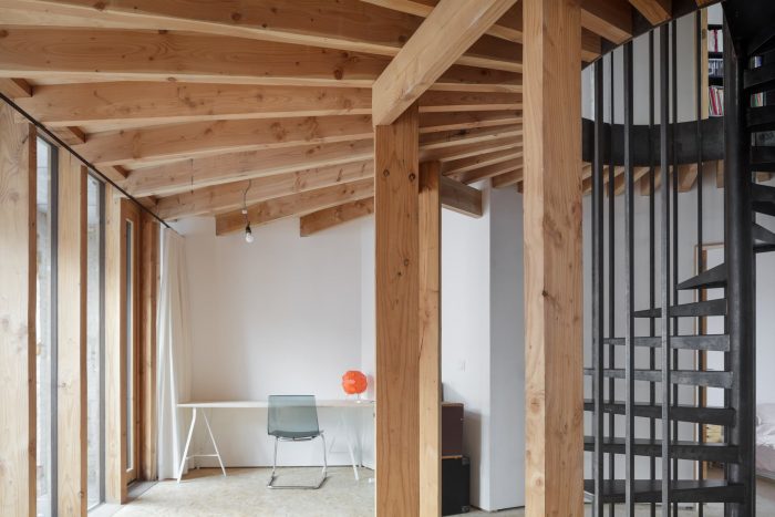 Like a snail in its shell, a new timber frame construction was fitted into these casco’s, making an interior space for a home. The intermediate spaces between the casco and the timber frame home generate new relations between inside and outside, help to organize the program on the plot and make the raw brick of the casco visible from the interior.