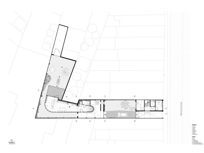 以外科手术的精度,最没有价值的部分被切掉,以在地块上产生光线和开放空间。最有价值的部分被整合起来,使之成为空旷的、可容纳的。这种 "坑 "的操作创造了一个小的 "Hinterhof",一个家庭住宅的理想环境。面向街道的房子被翻新为工作空间(精神病学的小组实践)。