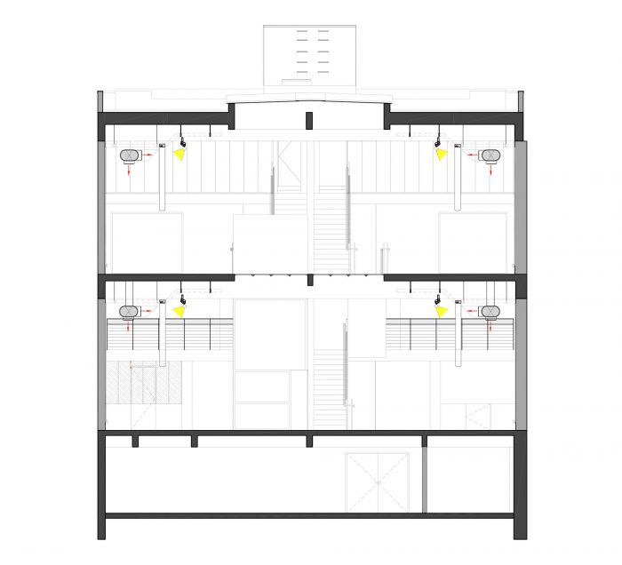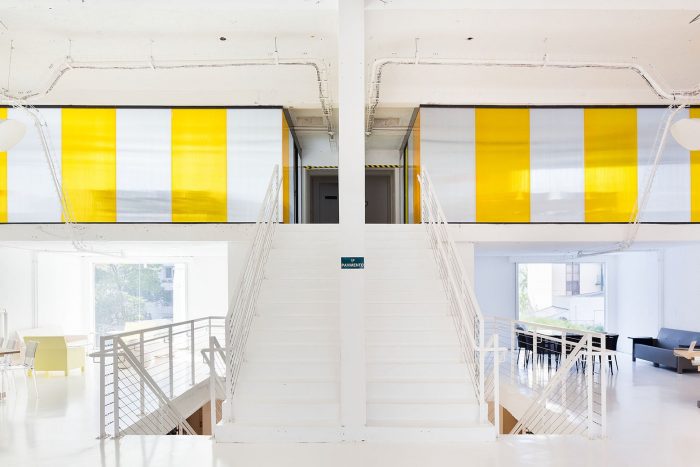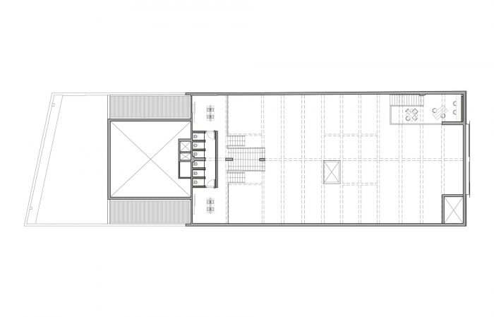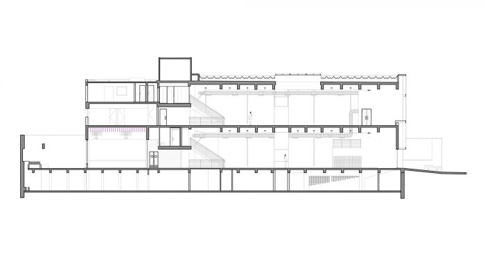 To anticipate these and others potential uses, the Triptyque agency neutralized this old games club from the 80s in painting in white all the place. There is a contrast between the existing walls roughness and the totally new ground. The lights are suspended from the concrete beams visible on the ceiling.