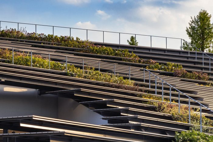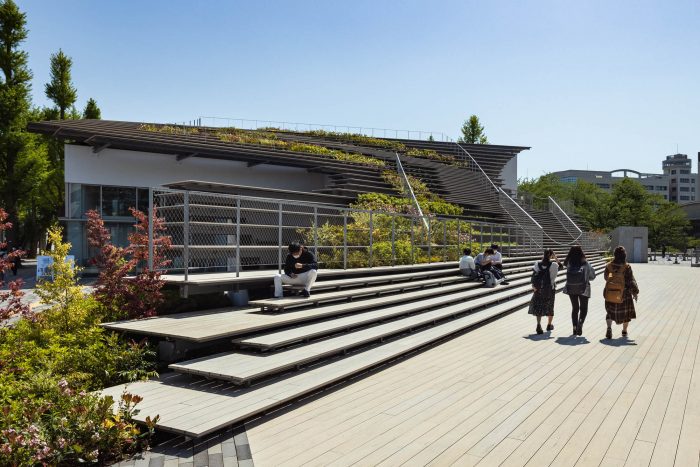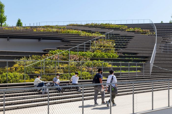 The “roof” which is composed of stepped greenery and bleachers, resonates with the green slanted wall of the adjacent library, collectively creating a green valley. The green valley serves as a new green space to invite life and activity for the students.