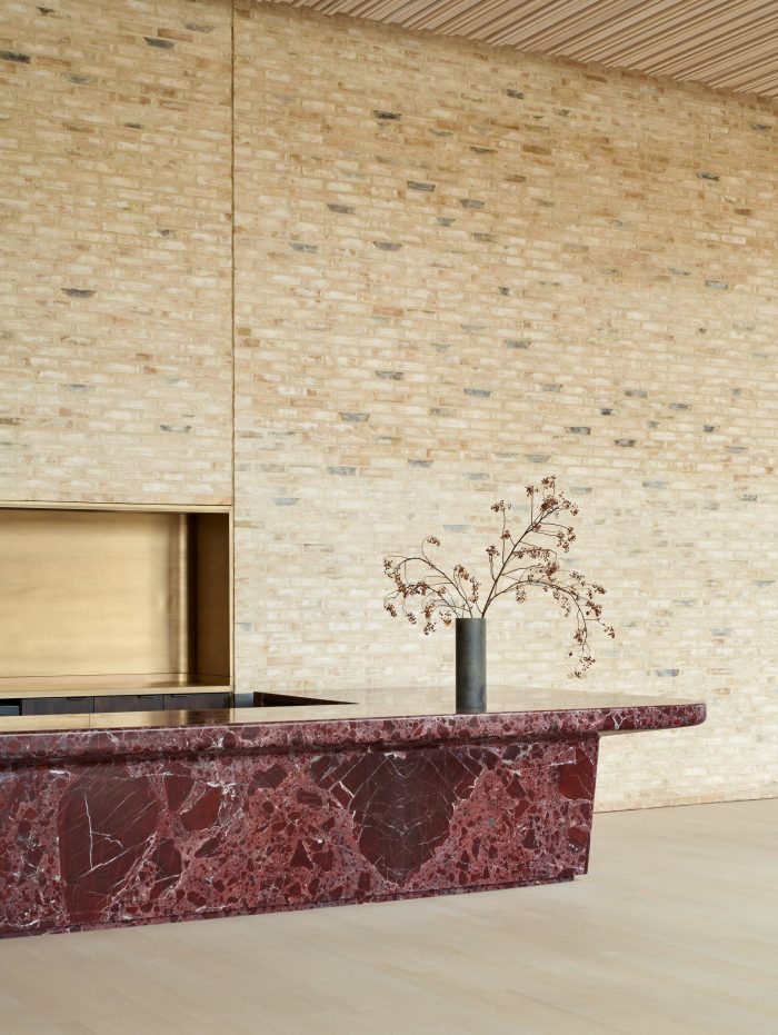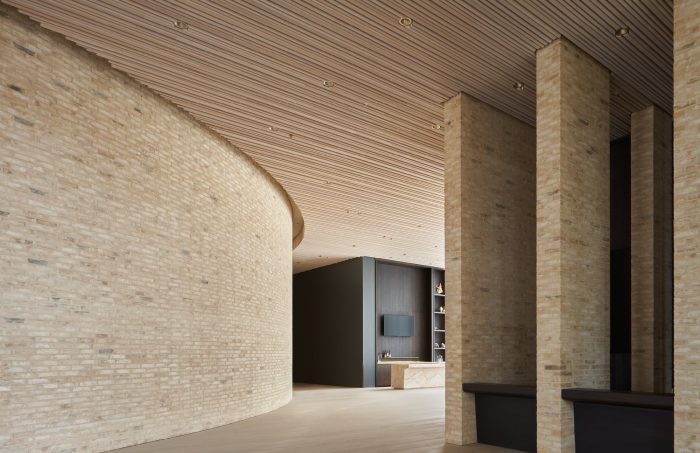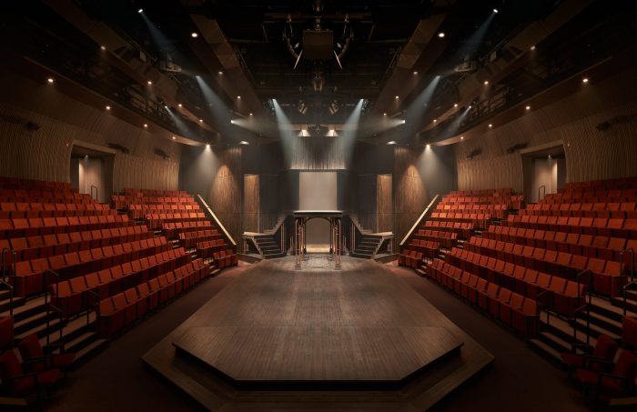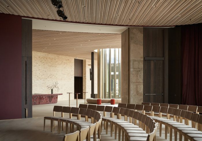 在界定公共房间的青铜幕墙的蜿蜒面纱的衬托下,马蹄形的剧院被轻轻弯曲的砂铸砖墙所包裹,表面的砂浆光滑得像石头。在木制的礼堂内,600个定制的座位围绕着一个修长的主舞台,创造了一个无与伦比的亲密感和卓越的声学环境。