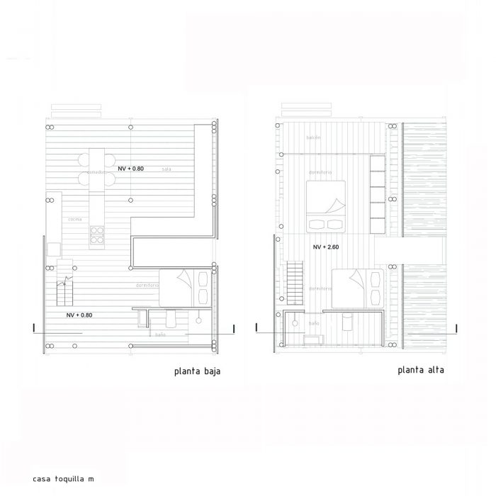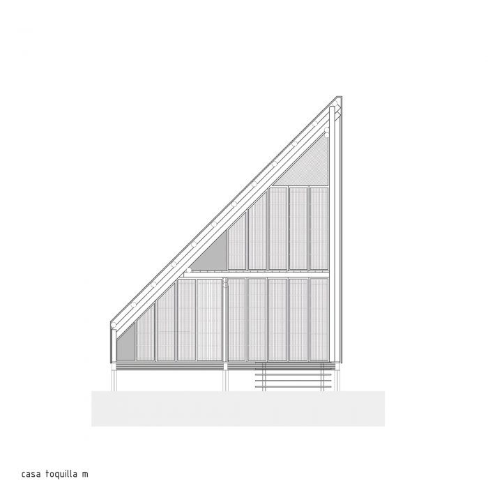 第一个住房原型Casa Toquilla M,面积为70平方米,直接建筑成本为16,000美元,是一个可以容纳8个舒适的人的房子,它被理想化为一个在桩上升高的甲板,以应对可能的洪水和材料的耐久性。对于住房,考虑到其居民聚集在外面享受微风的部门的宜居条件。会议空间与毗连天井的食物准备空间相关联,以供消费。