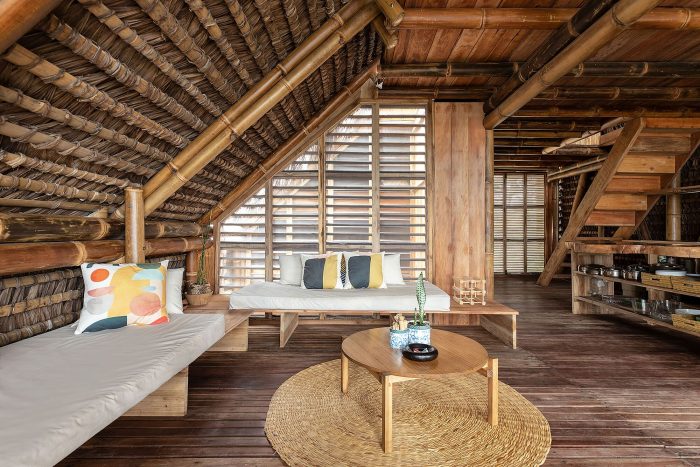 The technical details necessary to weave the toquilla straw were part of the spatial development, thus taking advantage of the slope of the roofs and generating a second useful floor. The spaces are open, generating a utility corridor that enhances cross ventilation throughout the house. A system of pambil partitions, very resistant to weather and humidity, is responsible for closing the house at night. No glass was required, but a mosquito net that attenuates the passage of wind at night, keeping it fresh. An air recirculation system is applied by means of a wooden grid on the floor that allows cold air to pass through the shade of the house itself.