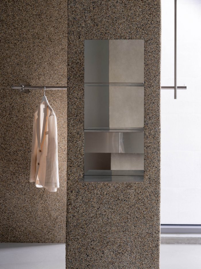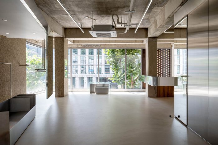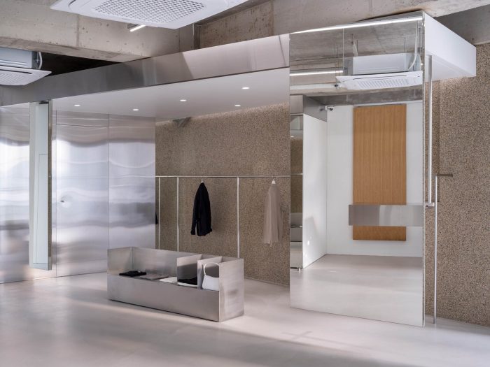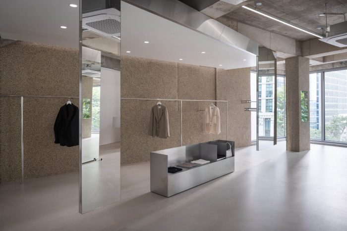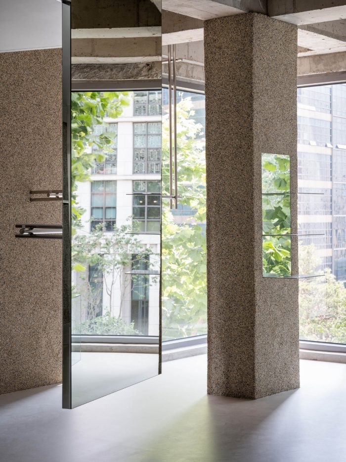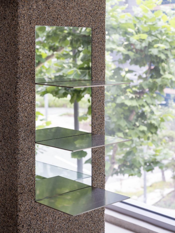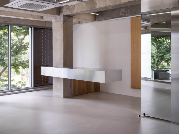 The exterior foliage is furthermore reflected through the mirrored surfaces of the interior display setup, rendering a relaxing and intemporal sense within. The spatial elements are few but indicative, with the floating linear items leading the eyesight towards the open sigh of the exterior.