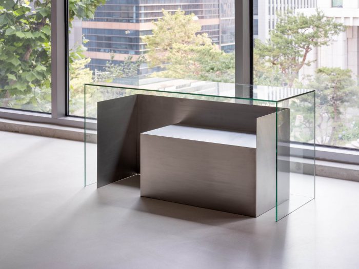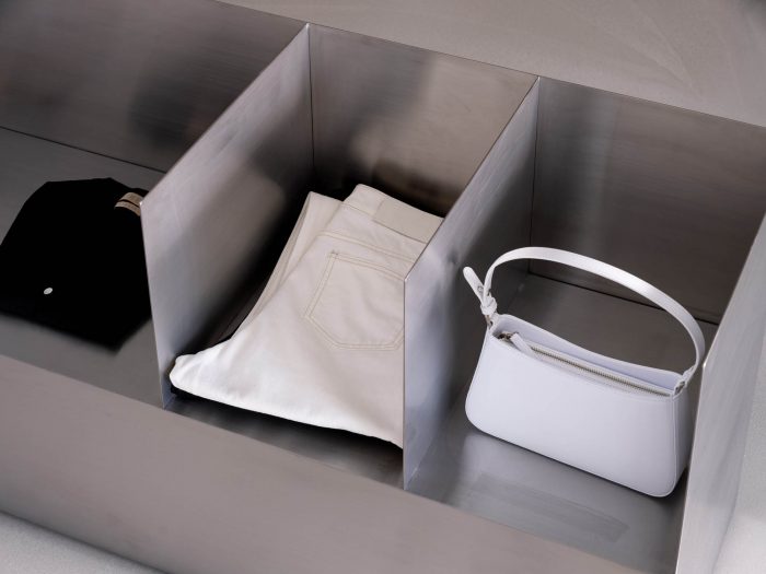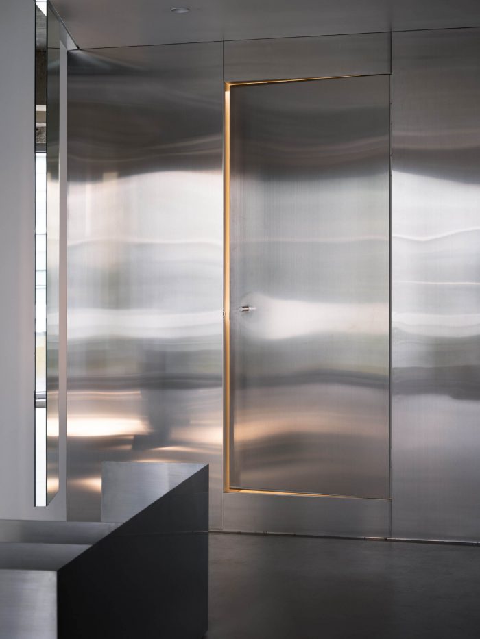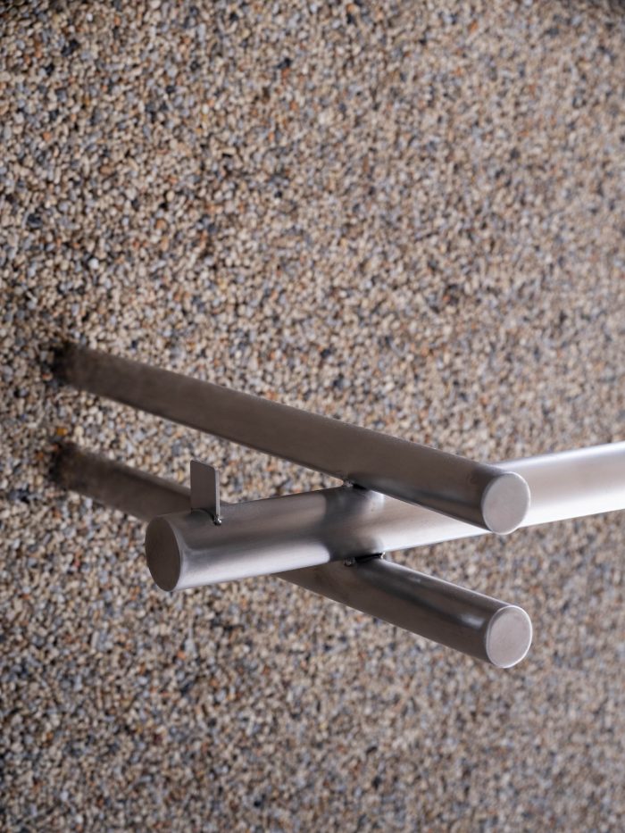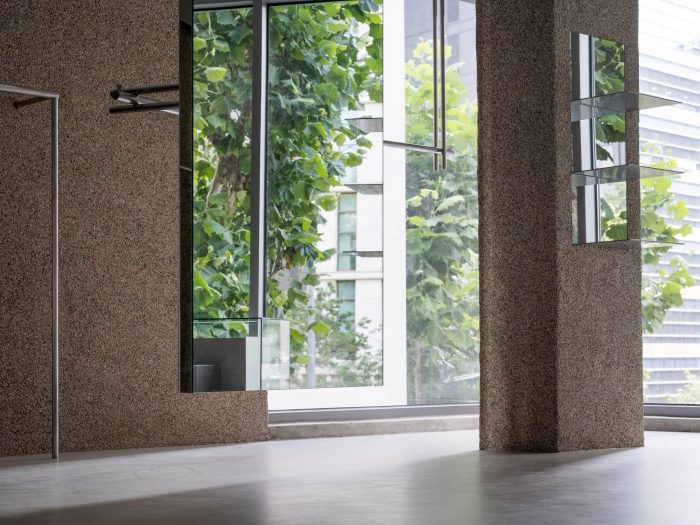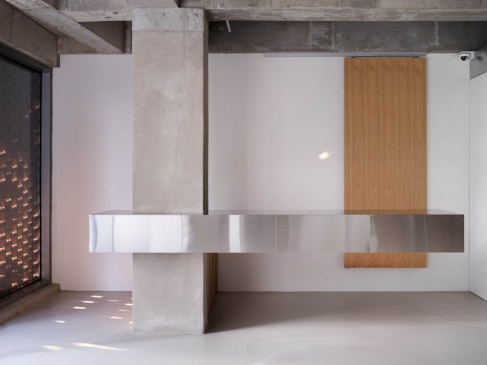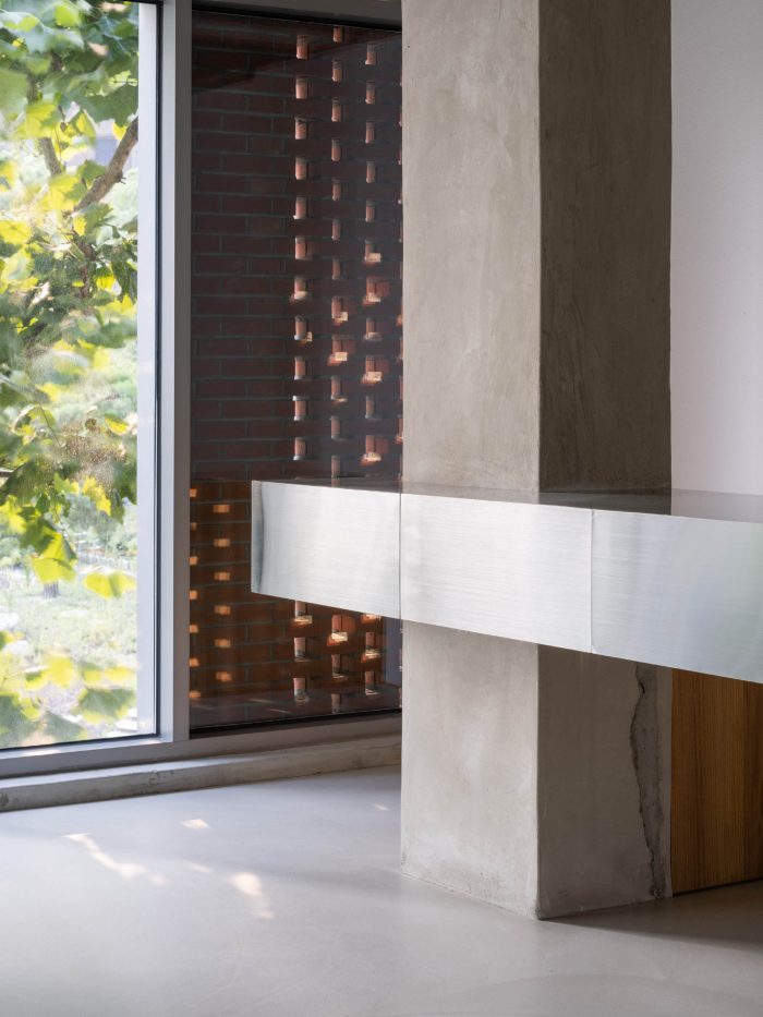The exterior foliage is furthermore reflected through the mirrored surfaces of the interior display setup, rendering a relaxing and intemporal sense within. The spatial elements are few but indicative, with the floating linear items leading the eyesight towards the open sigh of the exterior.