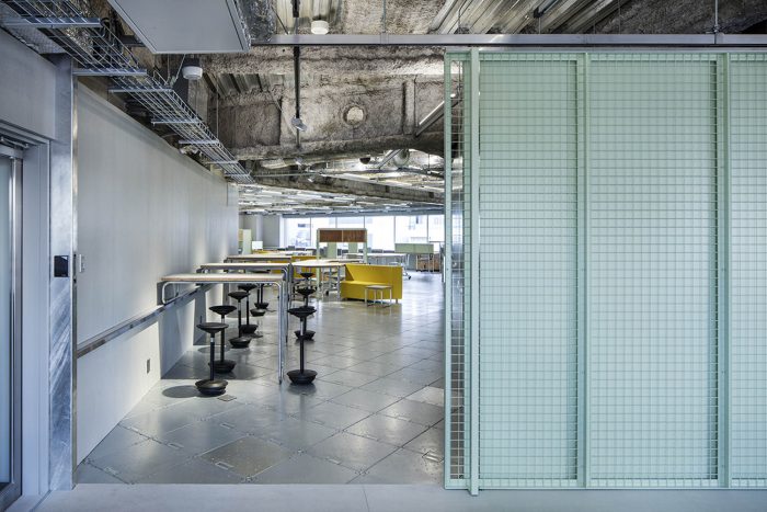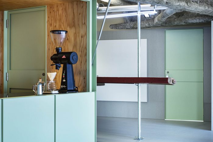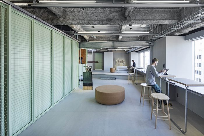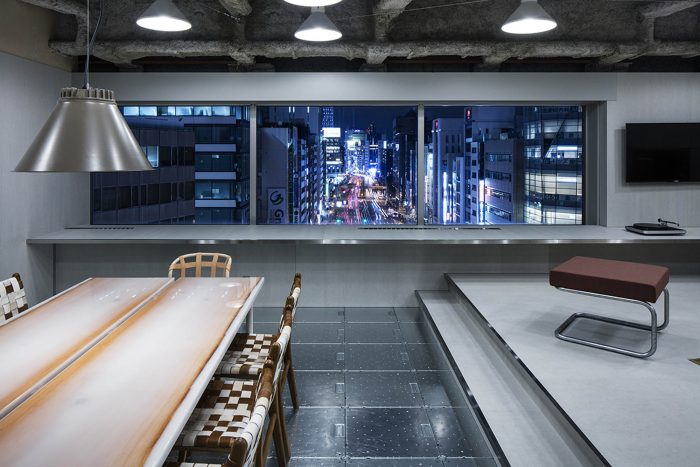 Rooms with different functions and characteristics, namely an office, lounge, and artists room are located around the core in such a way that each room is connected to a related function of a room in the core and also facing the most ideal window condition for its use. For example, the space in front of the storage and the meeting space becomes a free address office; the light-filled southeast window space in front of the cafe located in the core becomes a reception lounge; and the space between the northeast windows and the reception counter, where one experiences a spectacular feeling of floating above the city, accommodates a spatial sequence connecting the director's room, boardroom and VIP room, and artists room.