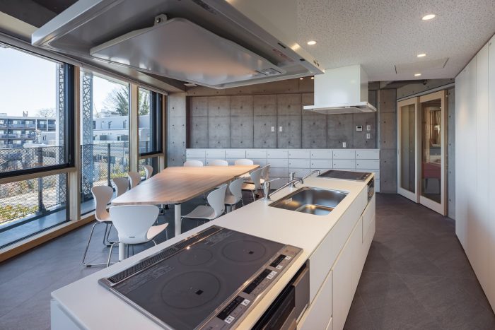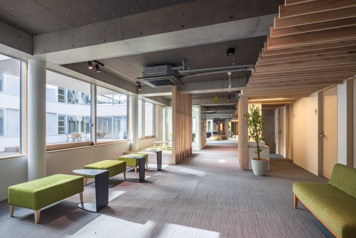Shared spaces located throughout the dormitory encourage various scales and types of interactions. As the common area of the entire building, there are study rooms, various studios, kitchen counters, and a cafeteria on the first floor. Living infrastructure such as toilets/showers, washbasins, and kitchens are all allocated in a continuous figure-8 space on the second floor and above. This living infrastructure is shared by 12 dormitory rooms. Study rooms, tatami corners, and small living spaces interspersed in the common space (living room) around the perimeter and courtyard mark a continuous space like a pathway with abundant wind and natural light, which fosters a relaxed community regardless of students’ infrastructure grouping.