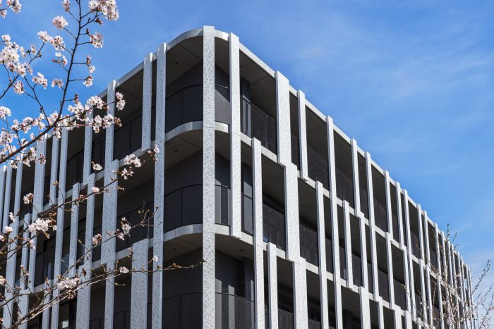 This international student dormitory with a mixed population of approximately 300 international and Japanese students was established by Toyo University as an SGU (Support for the Creation of Super Global Universities) in promoting internationalization. The site is adjacent to the Toyo University Akabanedai Campus, which opened in 2017, and is located on higher ground from the surrounding residential area. The continuous slope from the campus creates an elevation difference of approximately 4 m within the site, so the layout of the building to harmonize with the topography and surrounding environment became the key planning point.